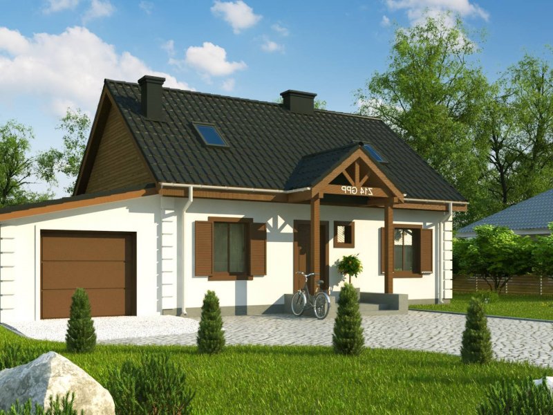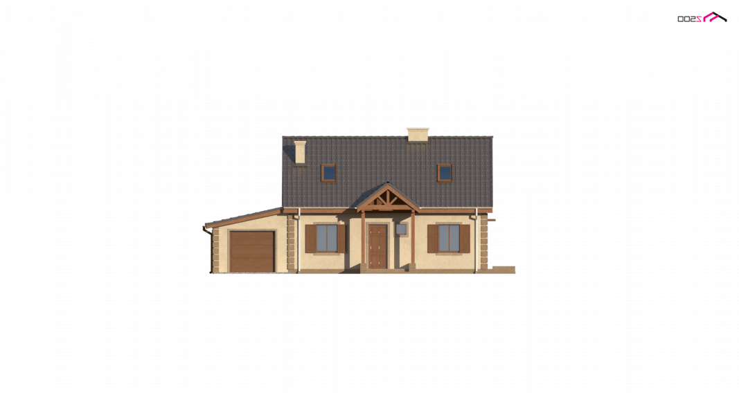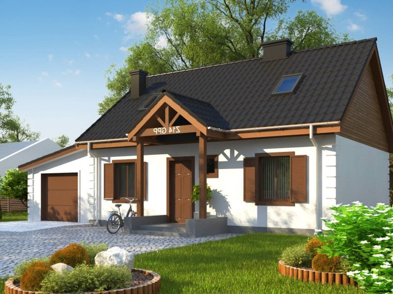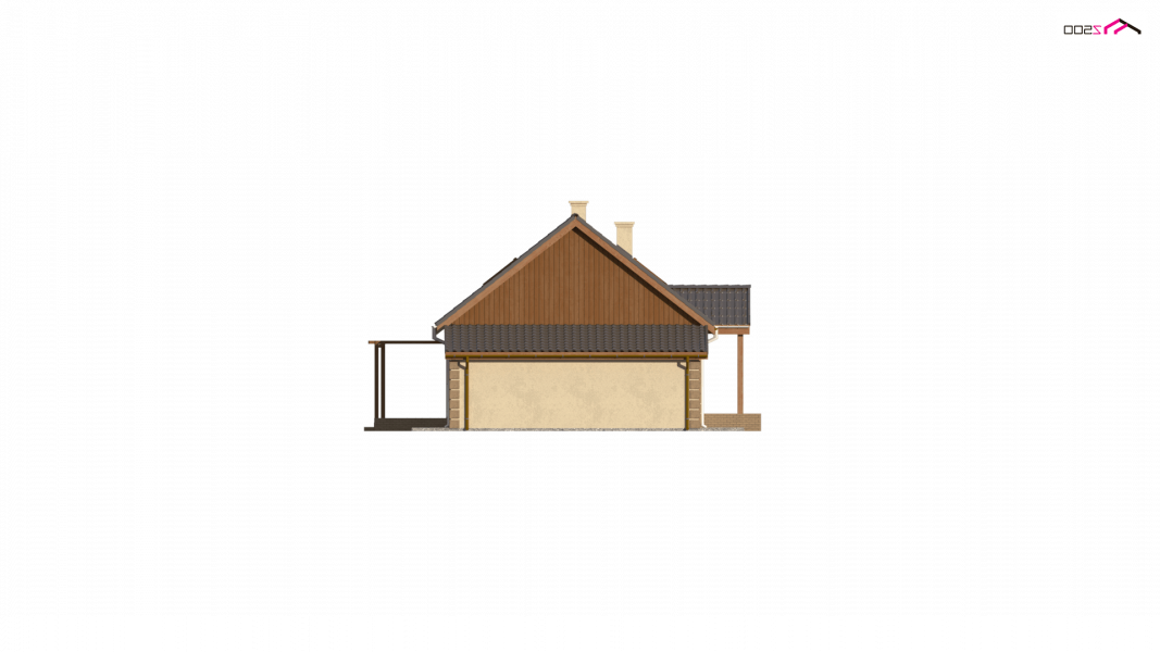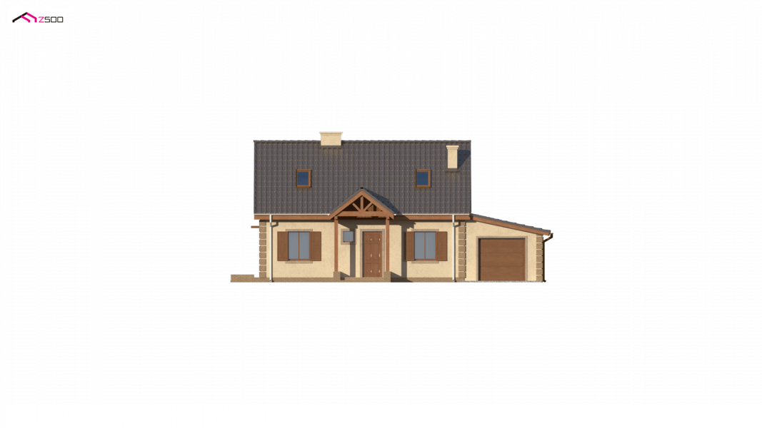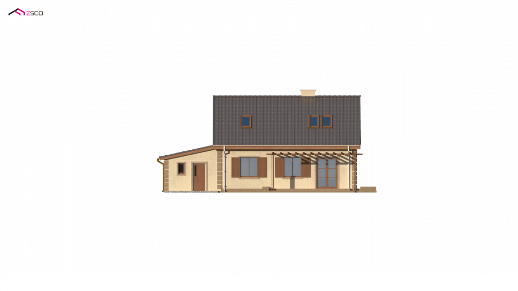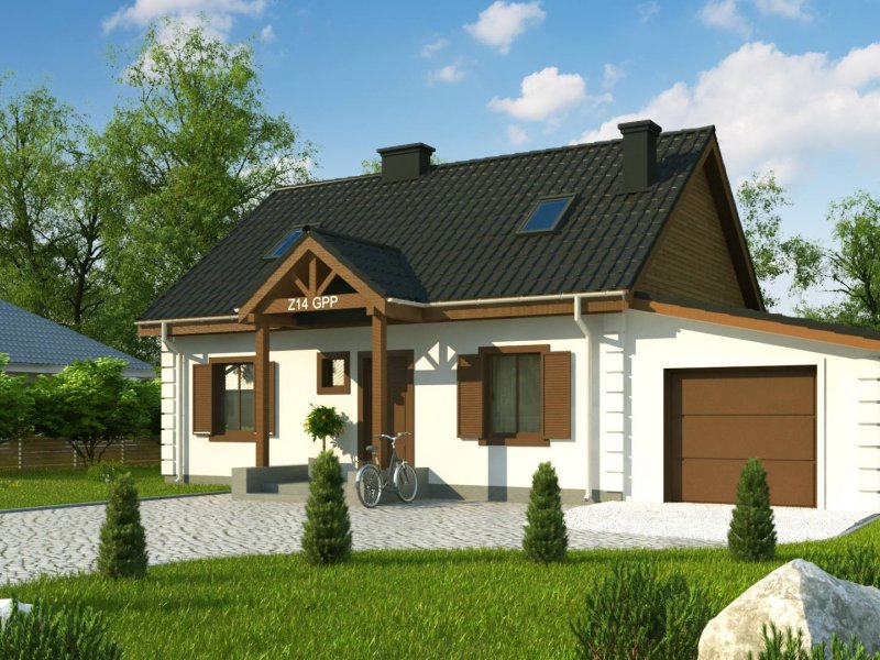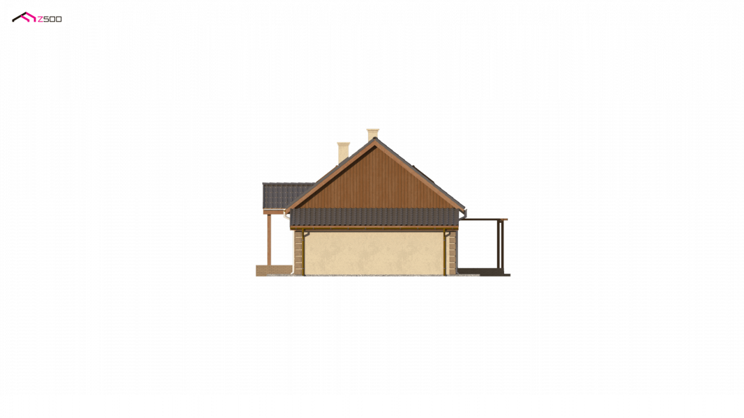 Projekt domu Z14 GP p posiada garaż jednostanowiskowy po prawej stronie (21,80m2) z pomieszczeniem gospodarczym. Nad garażem wykonano dach pulpitowy.