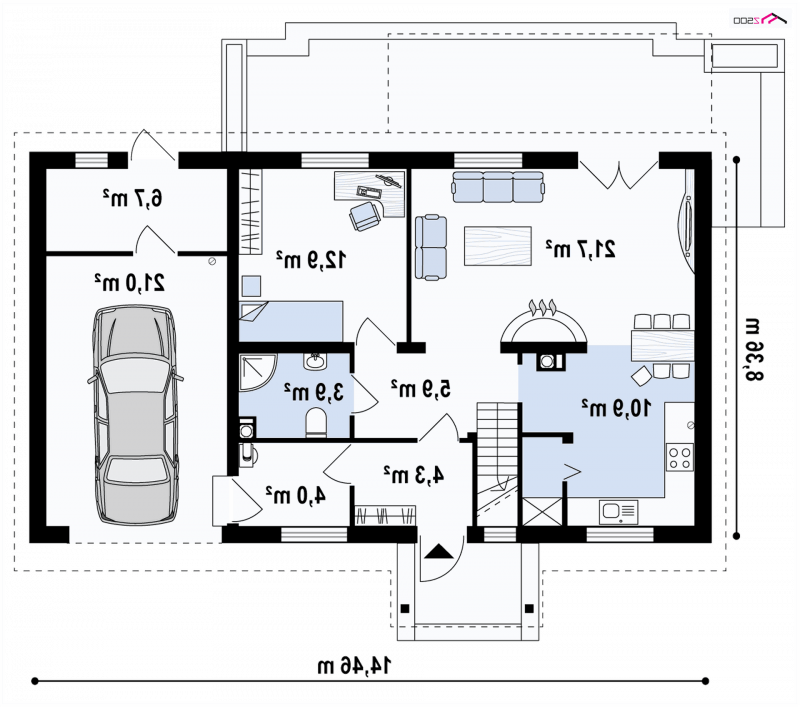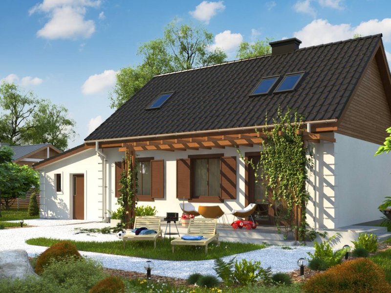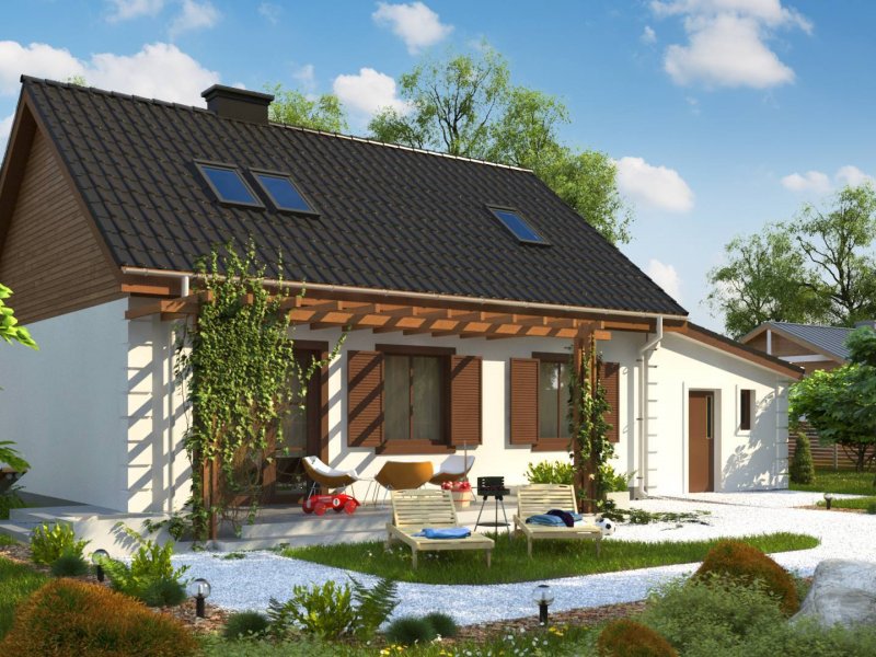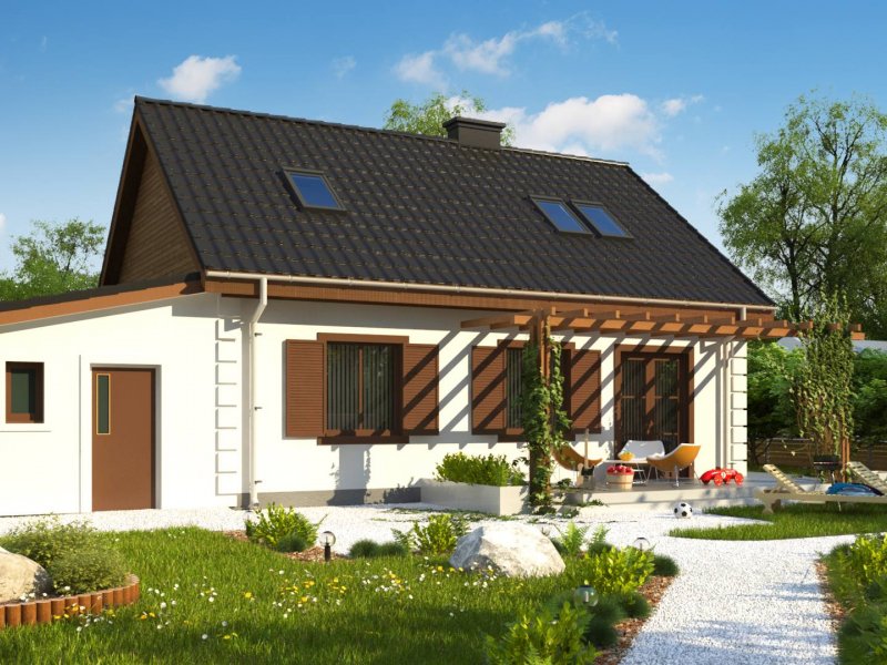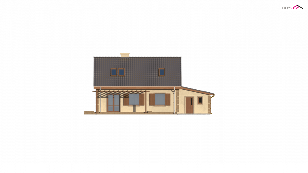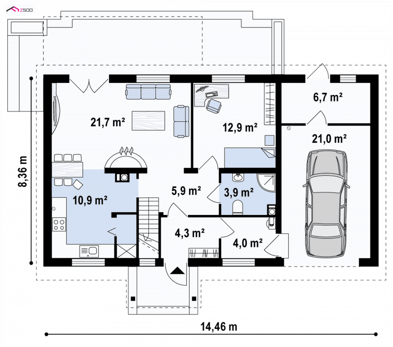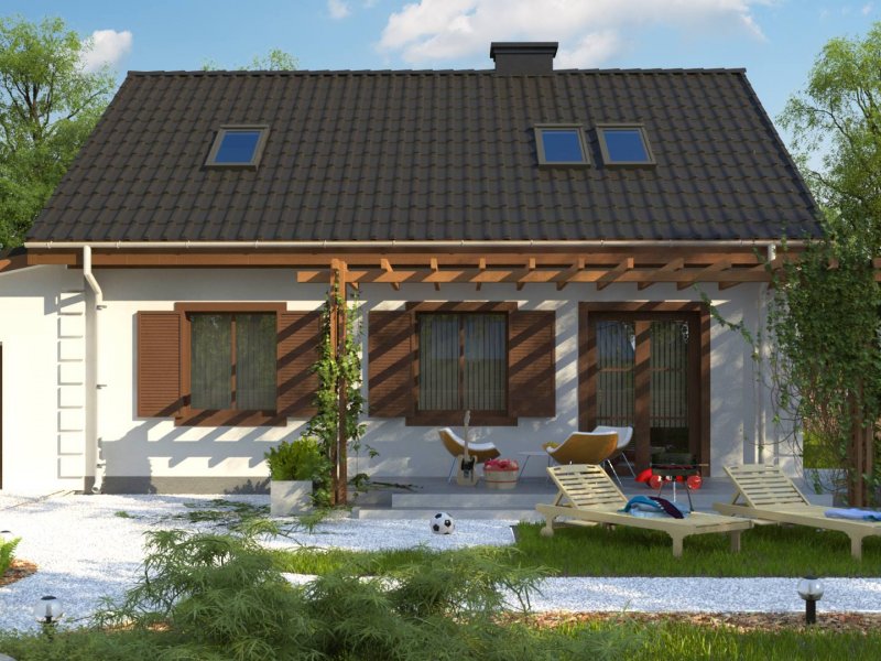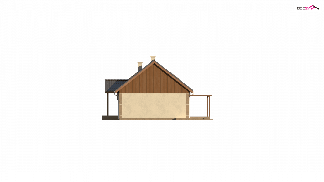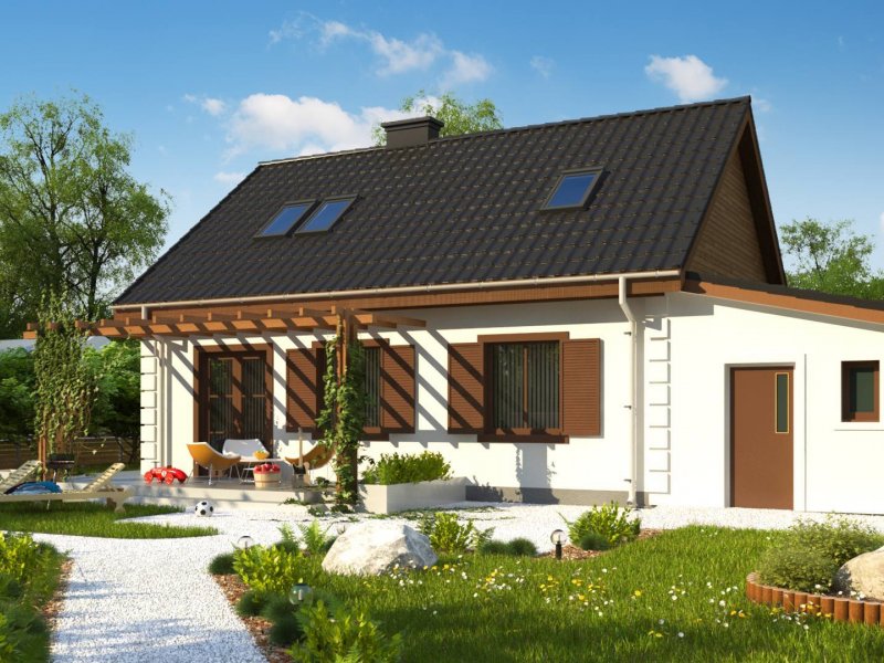 Projekt domu Z14 GP p posiada garaż jednostanowiskowy po prawej stronie (21,80m2) z pomieszczeniem gospodarczym. Nad garażem wykonano dach pulpitowy.