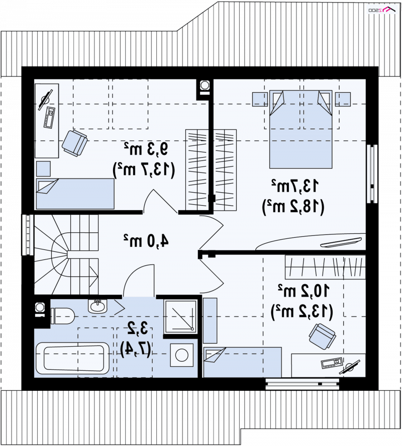Otwarta kompozycja kuchni świetnie powiększa całe pomieszczenie. Właściwie zabudowana zapewni niezwykły komfort użytkowania. Na piętrze znajdują się trzy komfortowe sypialnie oraz całkiem spora łazienka. W każdej sypialni zaprojektowano miejsce na szafę i biurko.