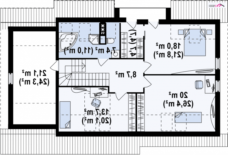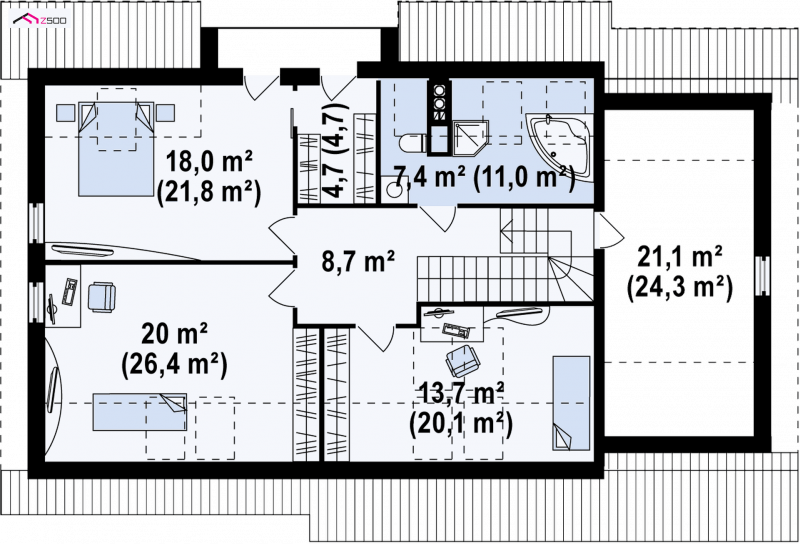 Komfortowo zaprojektowane pokoje na poddaszu posiadają miejsca na długie i pojemne szafy wnękowe. Pokoje są pięknie doświetlone oknami w ścianach szczytowych oraz oknami połaciowymi, z których można podziwiać niebo. W sypialni rodziców znajduje się osobista garderoba, a widok z uroczej lukarny prowadzi wprost do pięknie urządzonego ogrodu. Sypialnia ta posiada intymny balkonik. Z160 to propozycja dla pasjonatów wyjątkowych projektów.