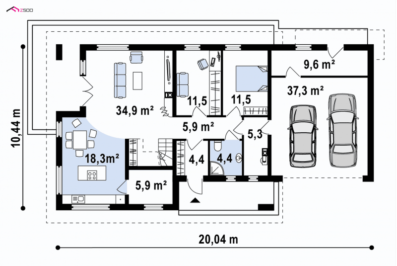 Dom wita długim i szerokim podcieniem wejściowym, z którego jest przejście do pojemnej sieni, a dalej strefy dziennej. Jednoprzestrzenna kuchnia i jadalnia otwierają się na salon. Wyeksponowane schody w kształcie litery U są dekoracyjnym elementem całej komunikacji na parterze, widocznym z salonowego aneksu wypoczynkowego. Warto by wykończyć je ciekawą balustradą, nawiązującą do stylu domu. Na parterze znajdują się jeszcze dwa pokoje, z których jeden może pełnić funkcję gabinetu. Przejście z domu do garażu zapewnione jest poprzez doświetlone pomieszczenie gospodarcze.