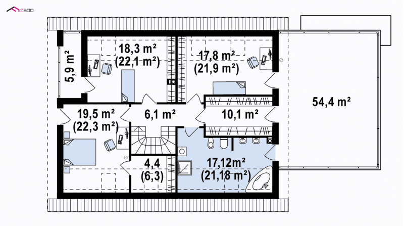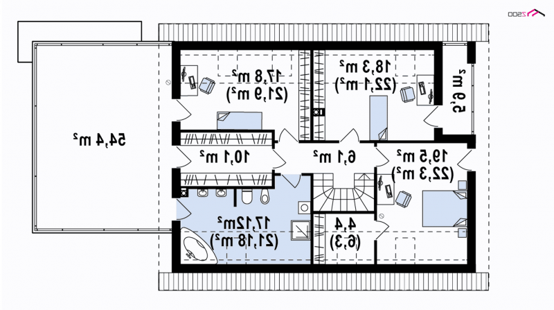 Część nocna to trzy duże sypialnie, pokój kąpielowy z możliwością wydzielenia pralni oraz wyjściem na taras. Z holu jest także dostęp do dużej garderoby, którą ewentualnie można zaadaptować na dodatkowy pokój z wyjściem na taras.