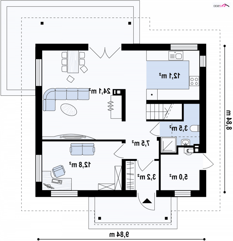 Z162v3 to wersja projektu z162 z kuchnia od strony ogrodu oraz kotłownią na paliwo stałe i rekuperacją. Dzięki konstrukcji układ funkcjonalny można dość łatwo zmienić i przenieść kuchnię w miejsce gabinetu, od frontu.