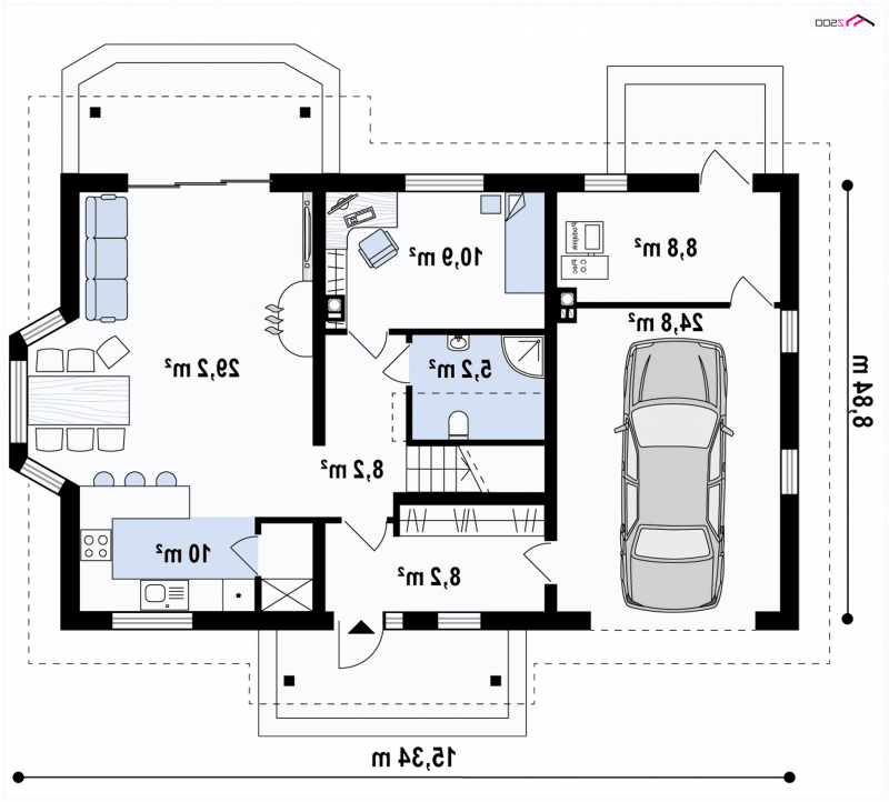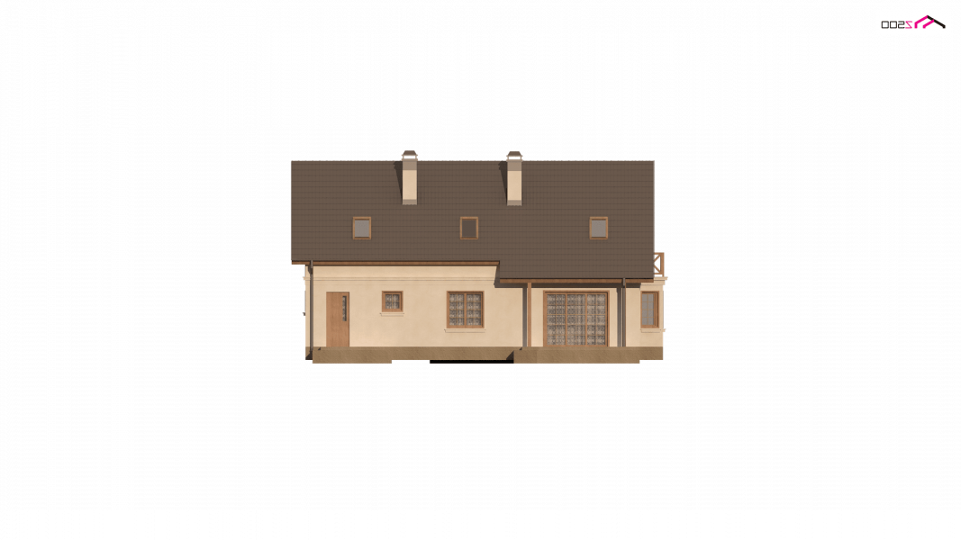 W prawej części domu zlokalizowano strefę reprezentacyjną. Tworzy ją przestronny salon połączony z jadalnią w wykuszu oraz otwartą kuchnią. W salonie znajduje się kominek oraz duże przesuwne drzwi balkonowe, które prowadzą na zadaszony taras. Na parterze zaprojektowano także podręczną spiżarnię, pomieszczenie gospodarcze, wc oraz pokój gościnny. Do garażu można dostać się zarówno przez garderobę jak i pom. gospodarcze. Na piętrze znajdują się strefa nocna. Są tu 4 duże sypialnie, duża łazienka z wanną oraz wydzielonym pomieszczeniem na pralnie . Dwa bliźniacze pokoje posiadają wyjście na balkon, a sypialnia gospodarzy została wyposażona w garderobę.