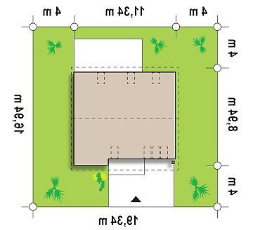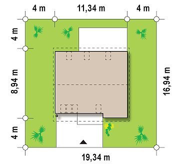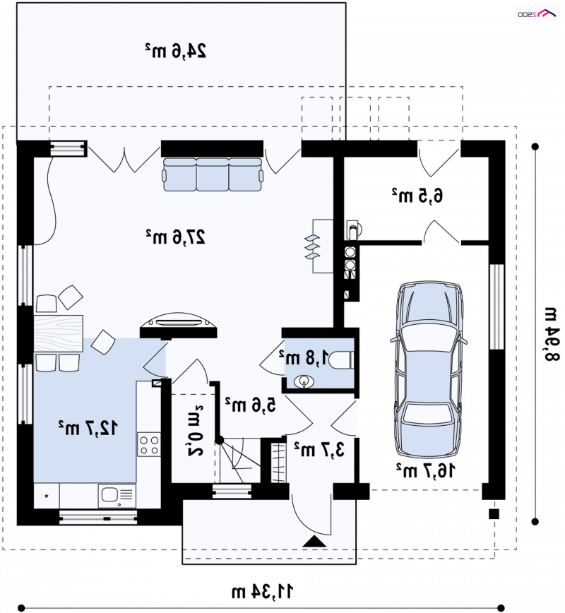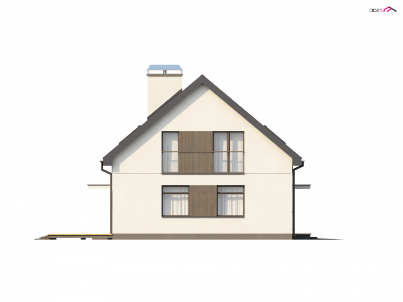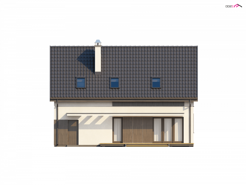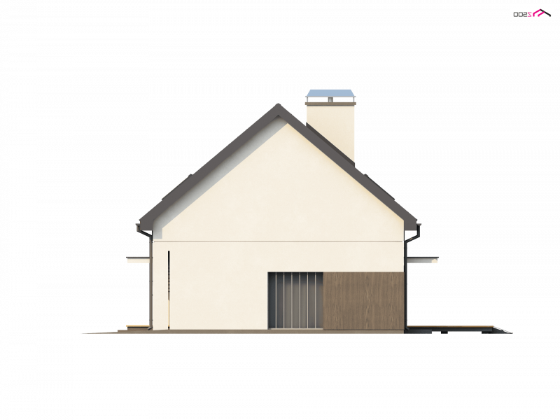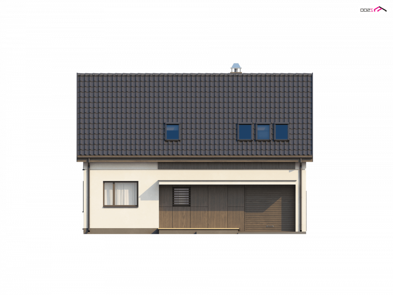 Charakterystycznymi elementami domu są poziome zadaszenia zarówno strefy wejściowej jak i części tarasowej. Mały ale funkcjonalny, z centralnie zaprojektowaną klatką schodową, którą doświetla dodatkowo okno połaciowe. Na parterze znajduje się garaż wbudowany w bryłę budynku i spora kotłownia. Zaletą tego projektu jest pojedyńczy komin co obniża koszty budowy i powoduje mniejsze straty ciepła.