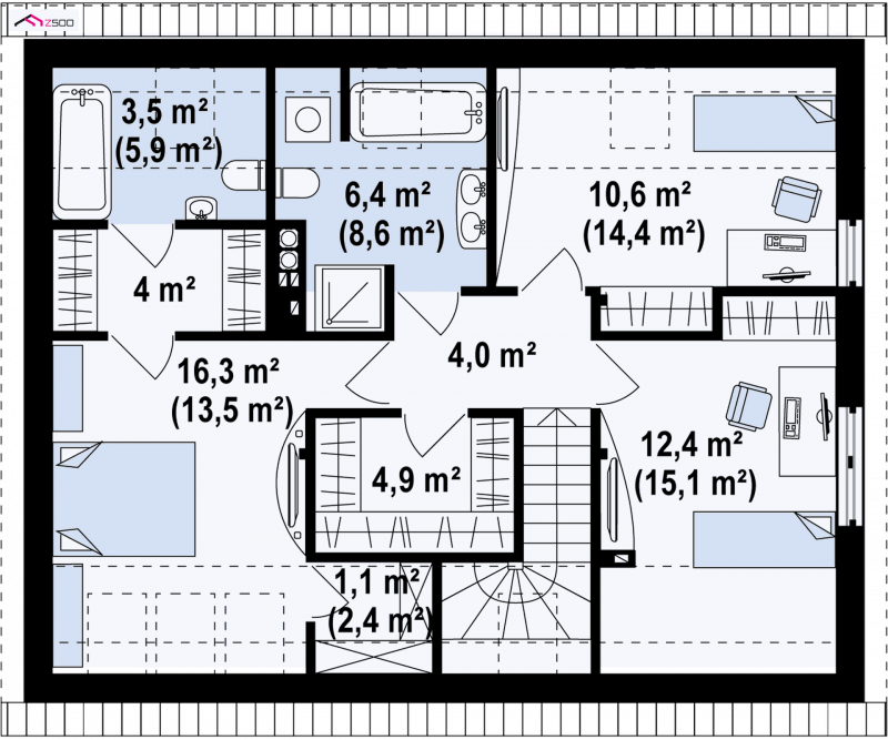 W części parterowej znajduje się część dzienno-rekreacyjna z dużym tarasem. Zaprojektowano dom z małą ilością komunikacji, z trzema sypialniami na poddaszu gdzie znajdują się też dwie garderoby i dwie łazienki. Z183 to idealna propozycja dla wszystkich szukających domu o wysmakowanej formie i funkcjonalnych rozwiązaniach.