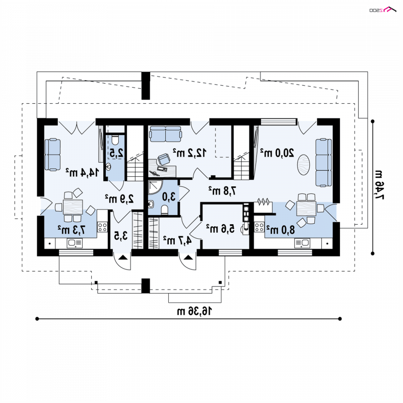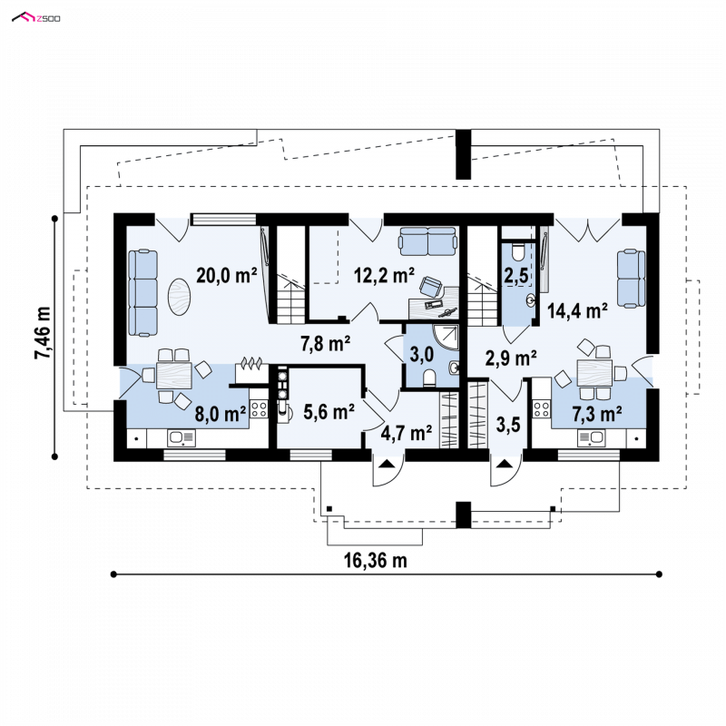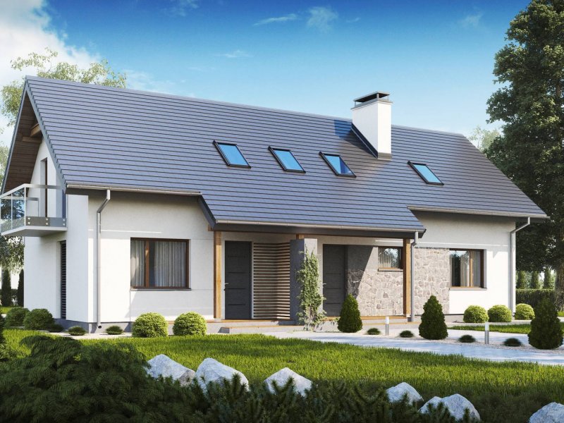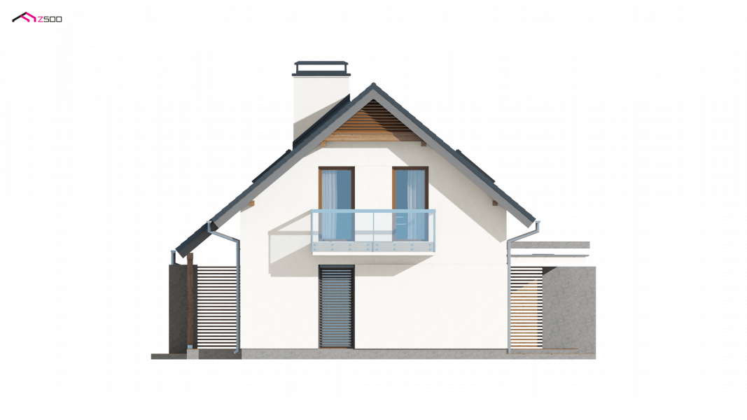 Z184 to dom dwurodzinny z osobnymi wejściami. Atutem projektu jest możliwość adaptacji mniejszego mieszkania na wiele sposobów w zależności od potrzeb.
