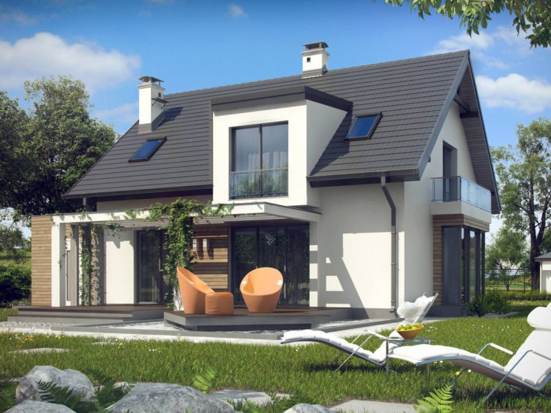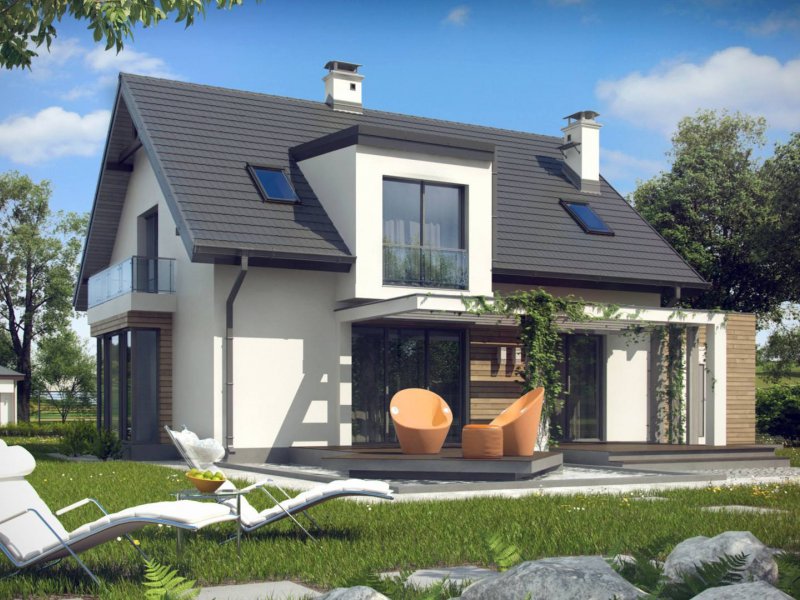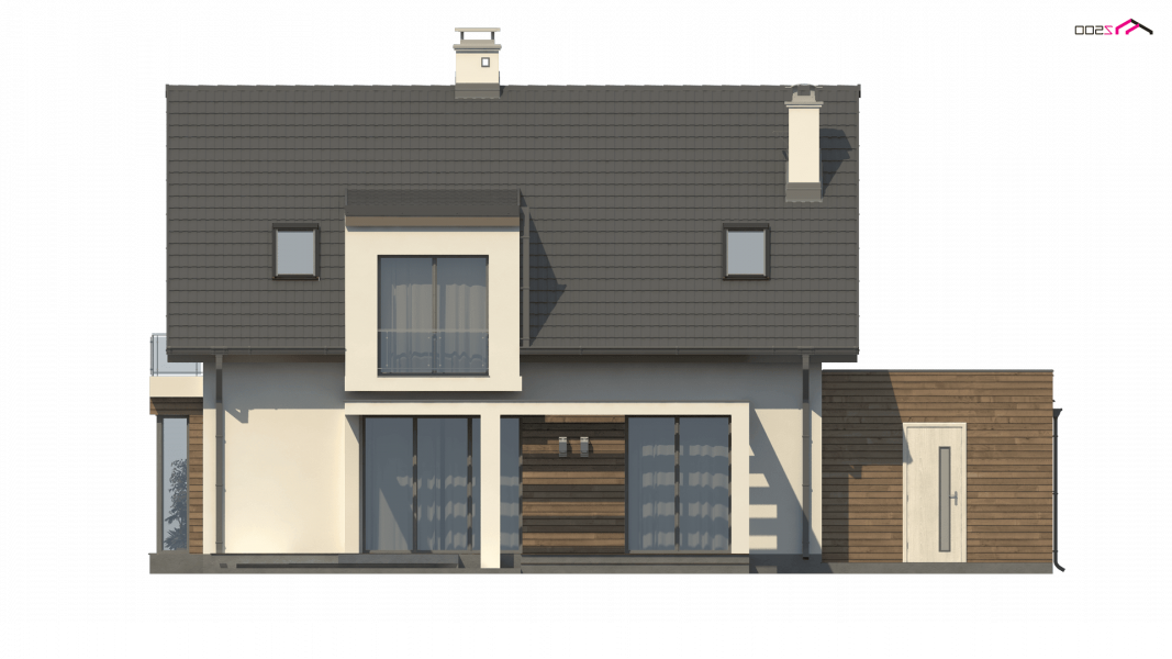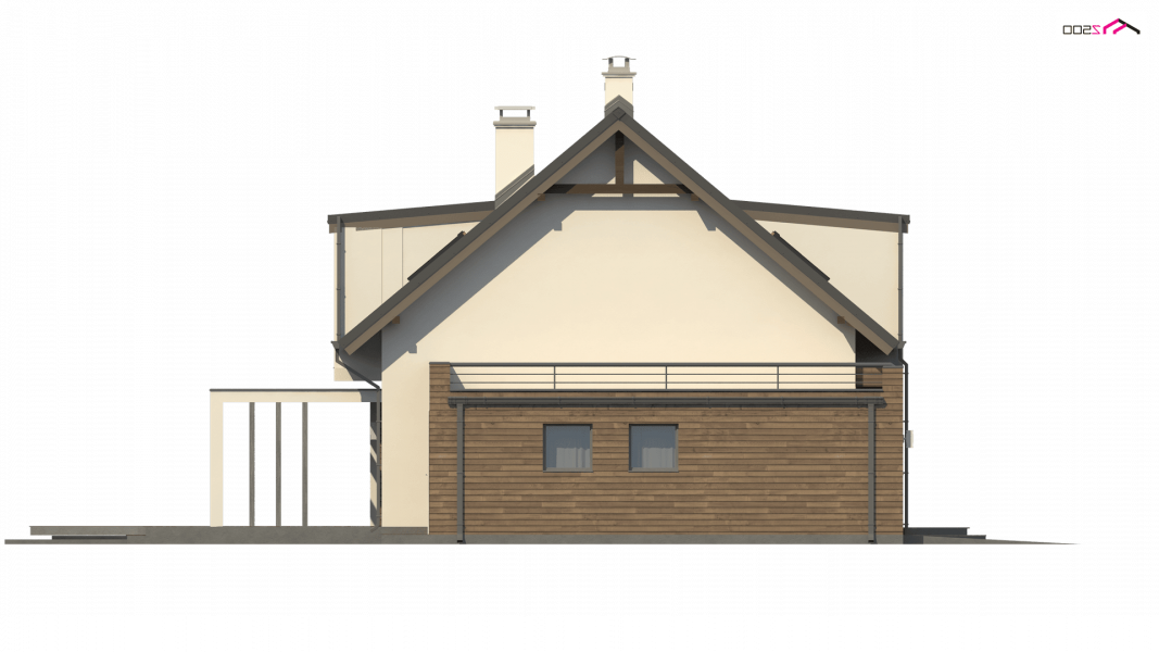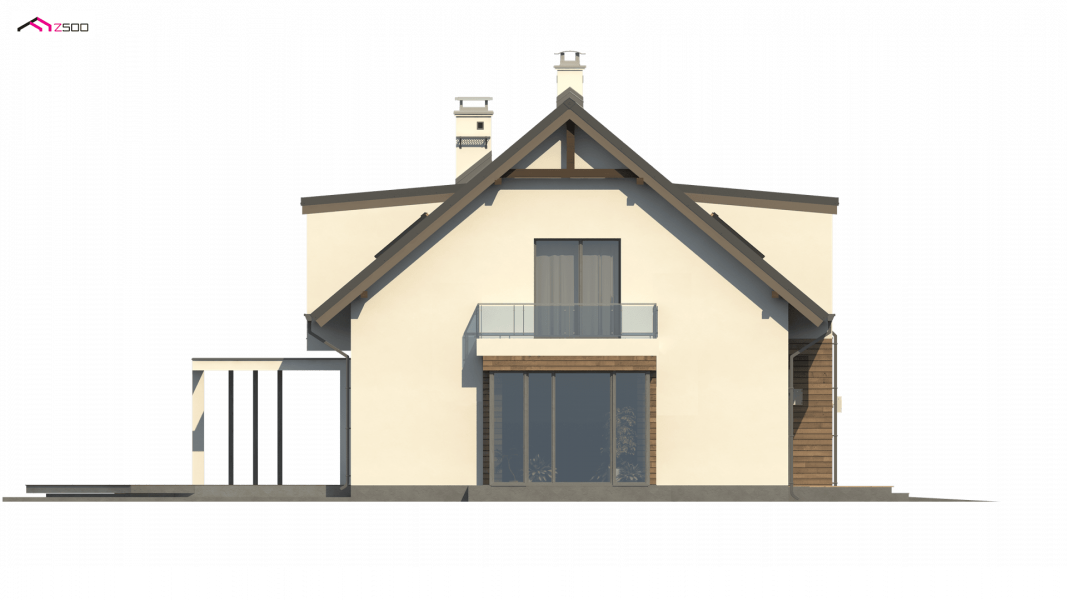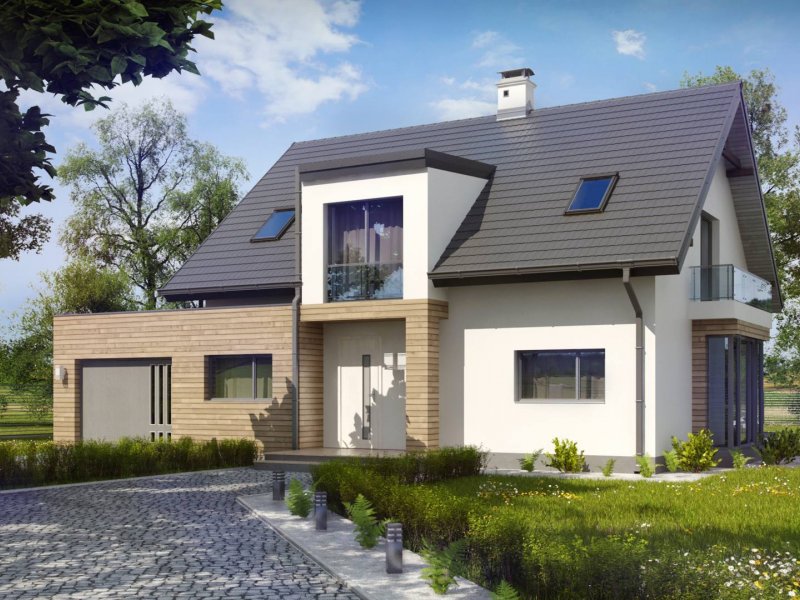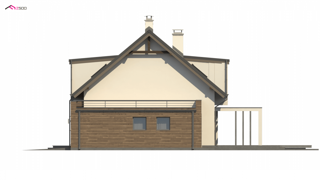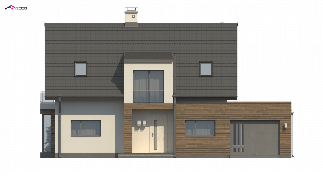 Projekt Z189 to propozycja domu z poddaszem użytkowym. Elewacja została ciekawie wykończona poprzez zastosowanie elementów z jasnego drewna, które dobrze współgrają z popielatą blachodachówką i jasnym tynkiem.