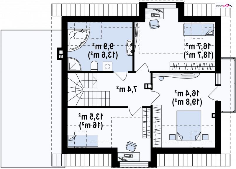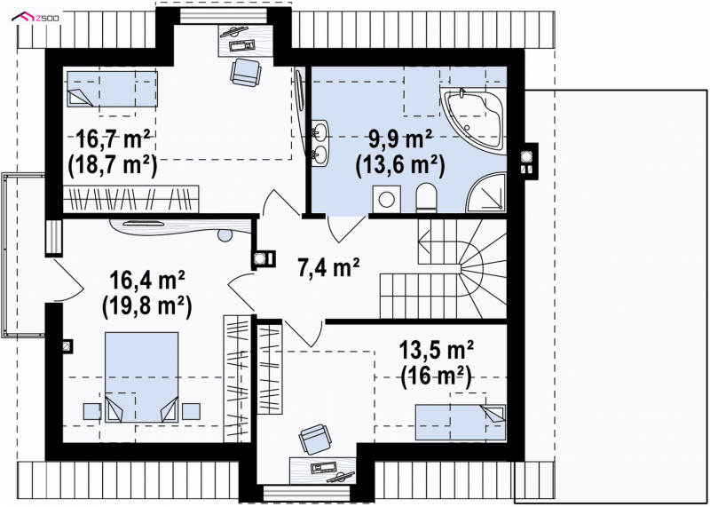 Parter to część dzienna domu. Znajduje się tu jasny, przestronny salon połączony z jadalnią w przeszklonym wykuszu oraz kuchnią. W centralnej części domu zlokalizowano hol, z którego jest dostęp do sieni z miejscem na dużą szafę wnękową, garderoby, gabinetu, który służyć może także jako pokój gościnny, oraz wc. Garaż, umieszczony w prawej części budynku, posiada bezpośrednie przejście do domu oraz duże pomieszczenie gospodarcze z możliwością wyjścia do ogrodu. Piętro to część nocna domu. Znajdują się tu trzy duże sypialnie oraz spora łazienka z miejscem na wannę i prysznic.