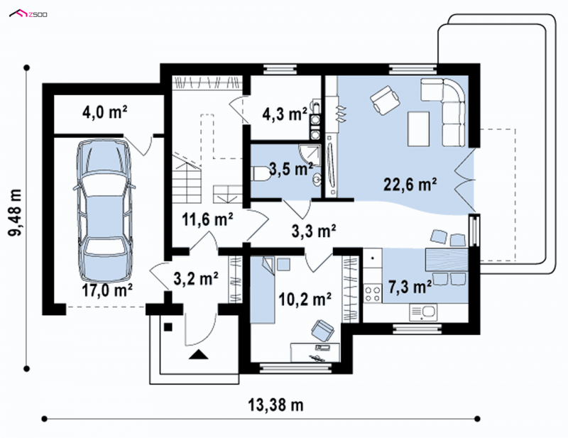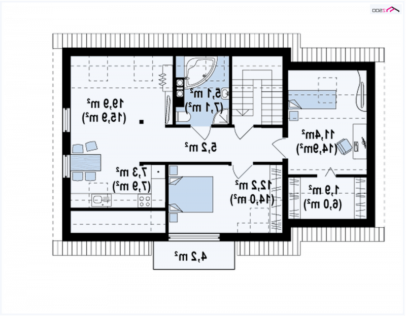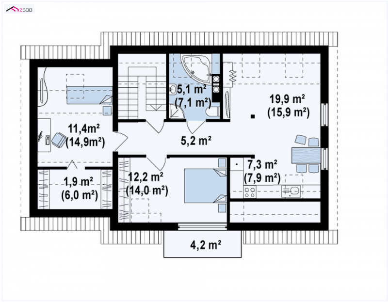 W Z192 dwa różnej wielkości mieszkania. Mieszkanie na parterze jest 2 pokojowe i ma powierzchnię 46,9 m2, mieszkanie na poddaszu ma natomiast 3 pokoje i 55,7m2. Te dwa mieszkania łączy część wspólna : sień, garaż, pomieszczenie gospodarcze, kotłownia oraz hol.