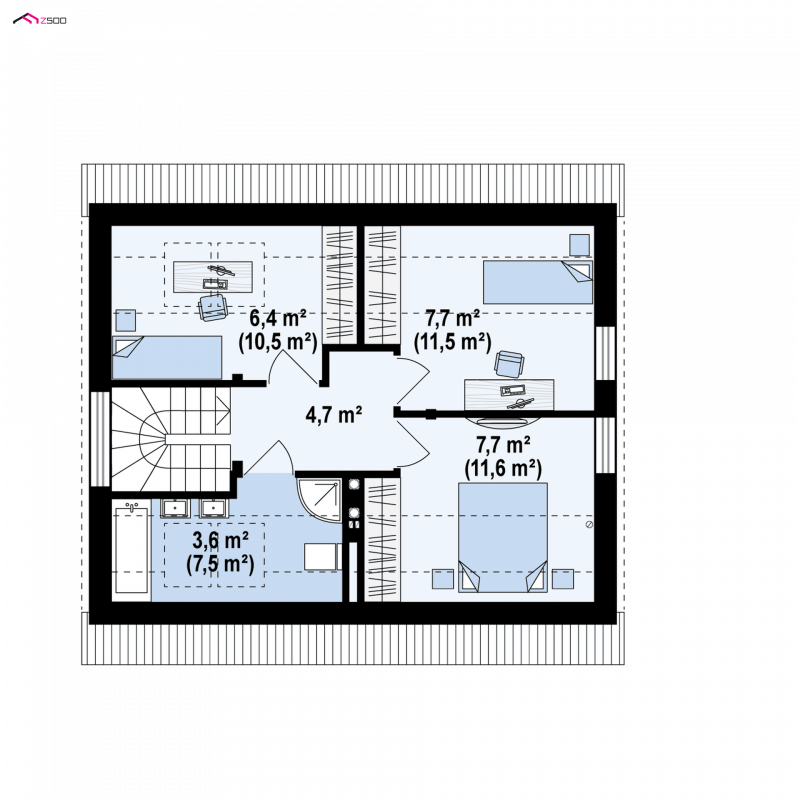 Poddasze to część nocna domu z trzema pokojami, oraz z dużą łazienką.