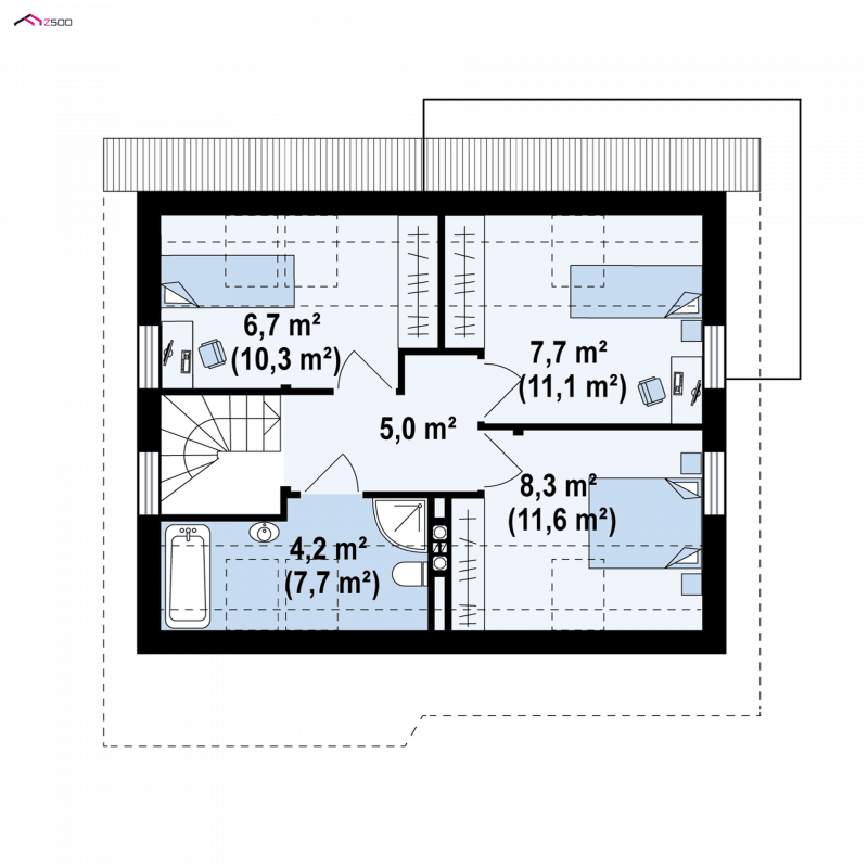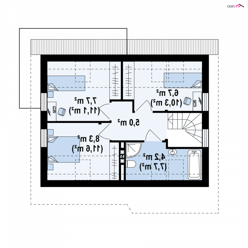 Na piętrze są dwa pokoje dla dzieci i sypialnia dla rodziców, a w każdym z pomieszczeń jest przewidziane miejsce na szafki. Obok schodów mieści się ogólnodostępna łazienka.
