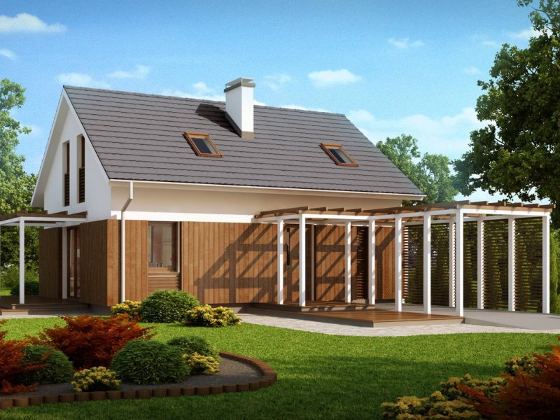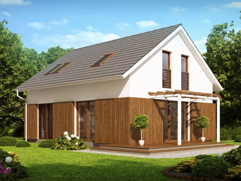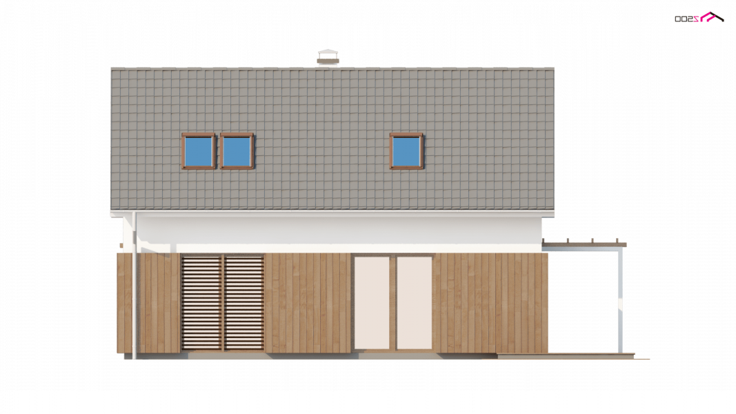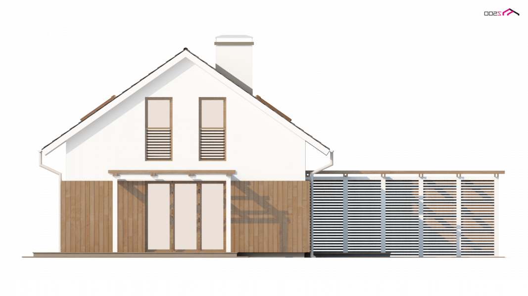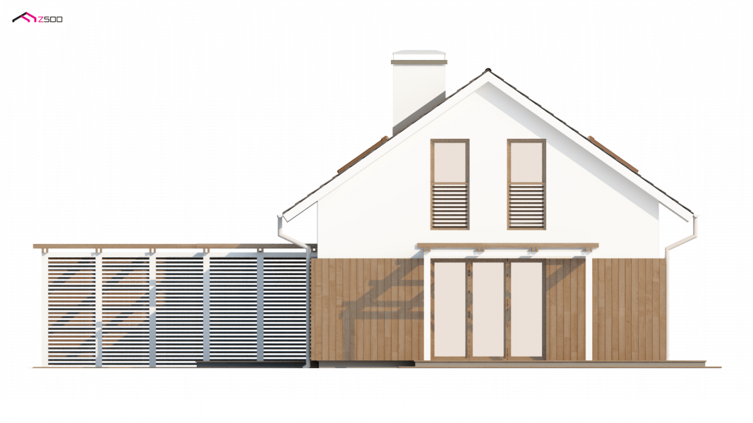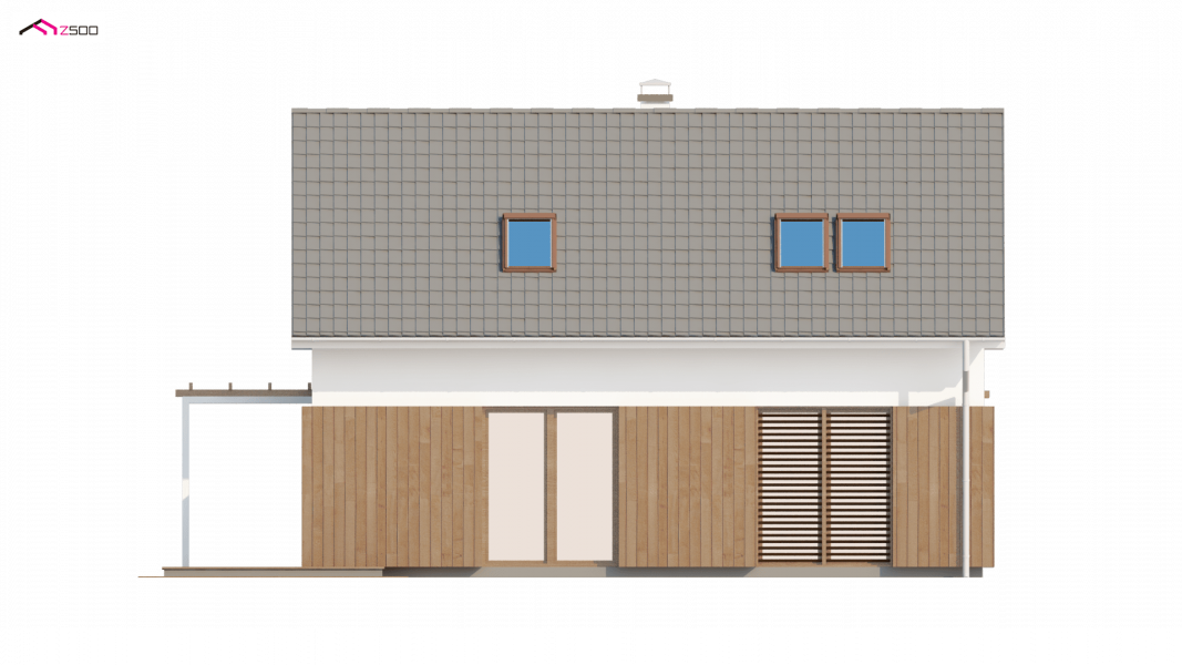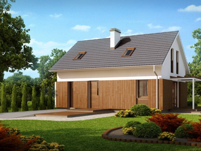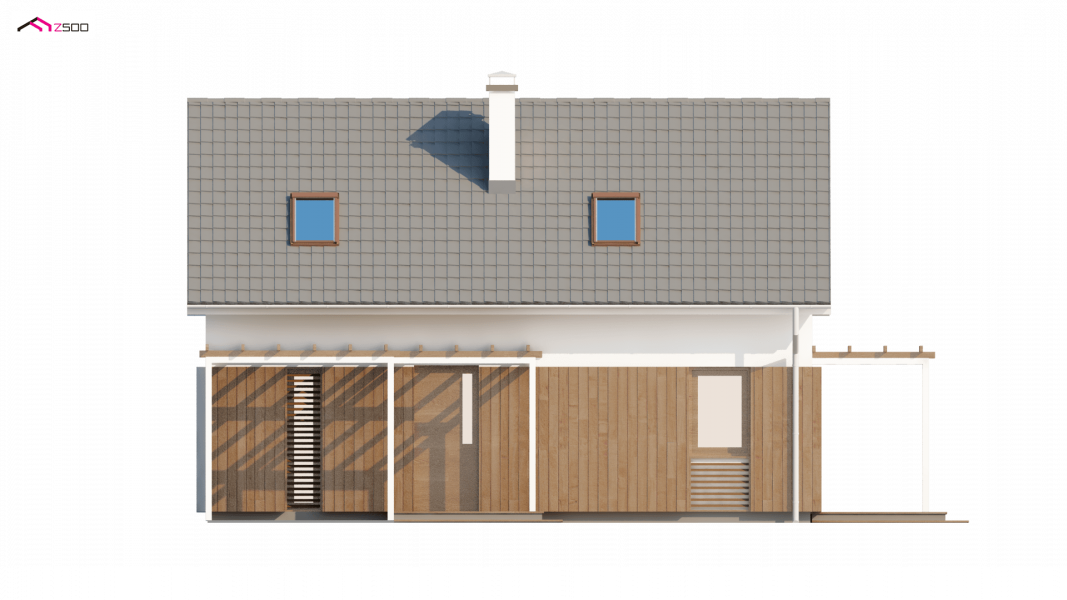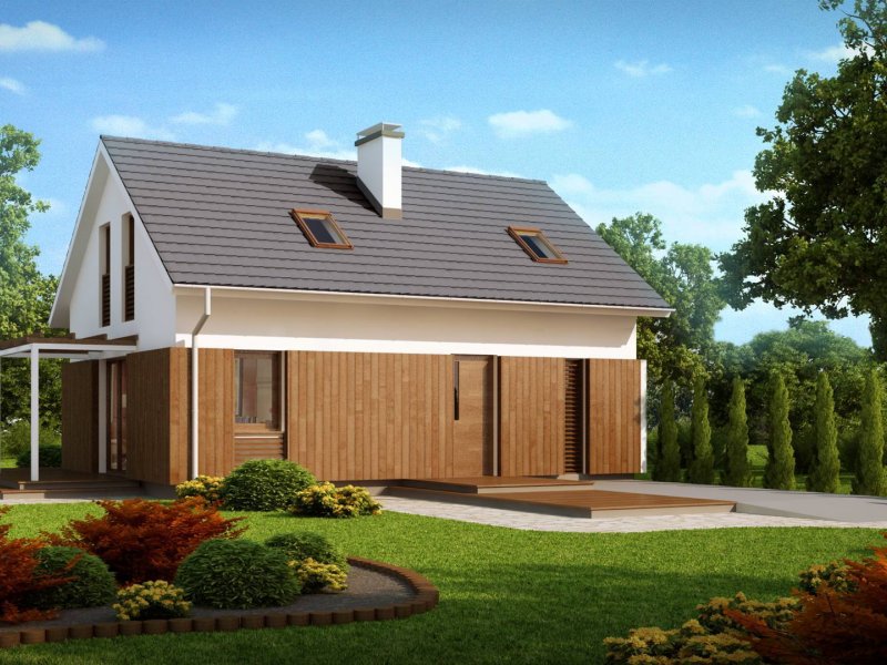 Rzut Z213 oparty na planie prostokąta zwieńczony jest prostym dachem dwuspadowym z wypuszczonymi okapami. Doświetlenie poddasze umożliwiają okna połaciowe oraz okna w ścianach szczytowych. Tradycyjne rozwiązanie bryły urozmaicone jest ciekawym elementem fragmentarycznego użycia drewna na parterze, co nadaje domowi więcej ciepła i sielskości.
