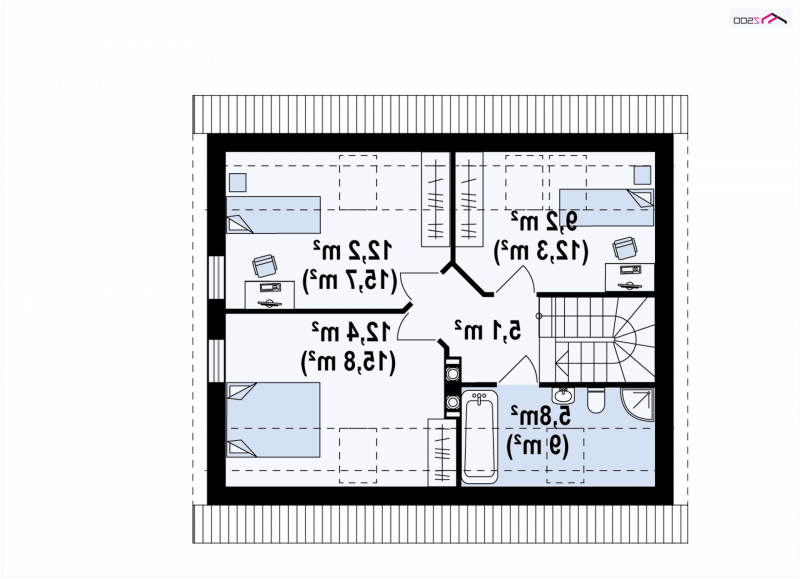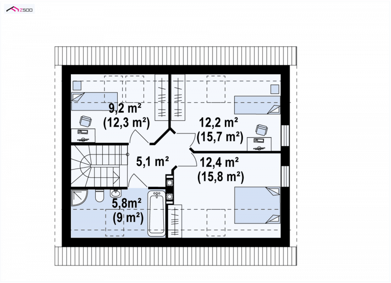 Na poddaszu zlokalizowane są trzy duże, wygodne sypialnie, które posiadają wspólną łazienkę. Ten mały i pojemny dom będzie stanowił wygodną i bezpieczną przystań dla całej rodziny, gdzie każdy będzie mógł znaleźć swoje miejsce. Zwarta bryła umożliwi zaś lokalizację tego domu na posesji o niedużych wymiarach oraz oszczędność na eksploatacji domu.