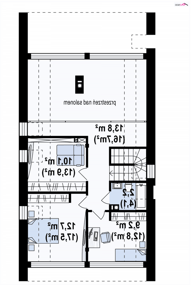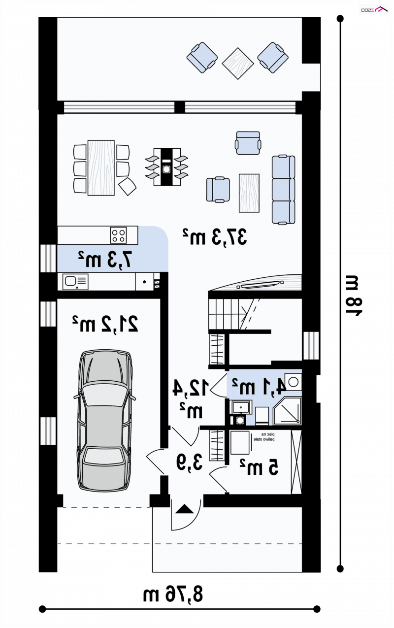 Dom charakteryzuje wyjątkowy układ pomieszczeń. Na parterze mieści się otwarta strefa dzienna, z charakterystyczną przeszkloną ścianą oraz kominkiem oddzielającym salon od jadalni. Dodatkowo w parterze zaprojektowano garaż z bezpośrednim dostępem do domu poprzez sień oraz PG i łazienkę. Strefa nocna na poddaszu to trzy duże sypialnie oraz łazienka. Zaletą domu jak i jego elementem nowoczesność jest strefa dzienna o wysokości dwóch kondygnacji oraz antresola na pietrze. Ten projekt to imponująca przestrzeń możliwości – z zewnątrz czaruje nowoczesnym wdziękiem, a wewnątrz uwodzi imponującym układem pomieszczeń.