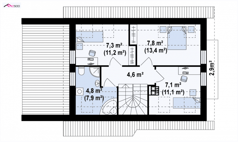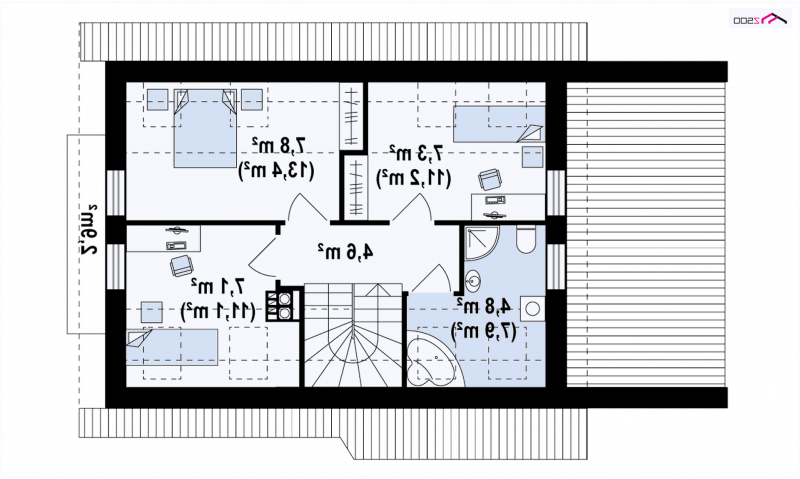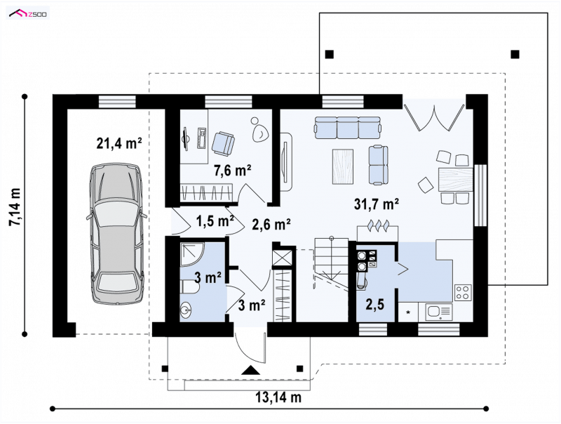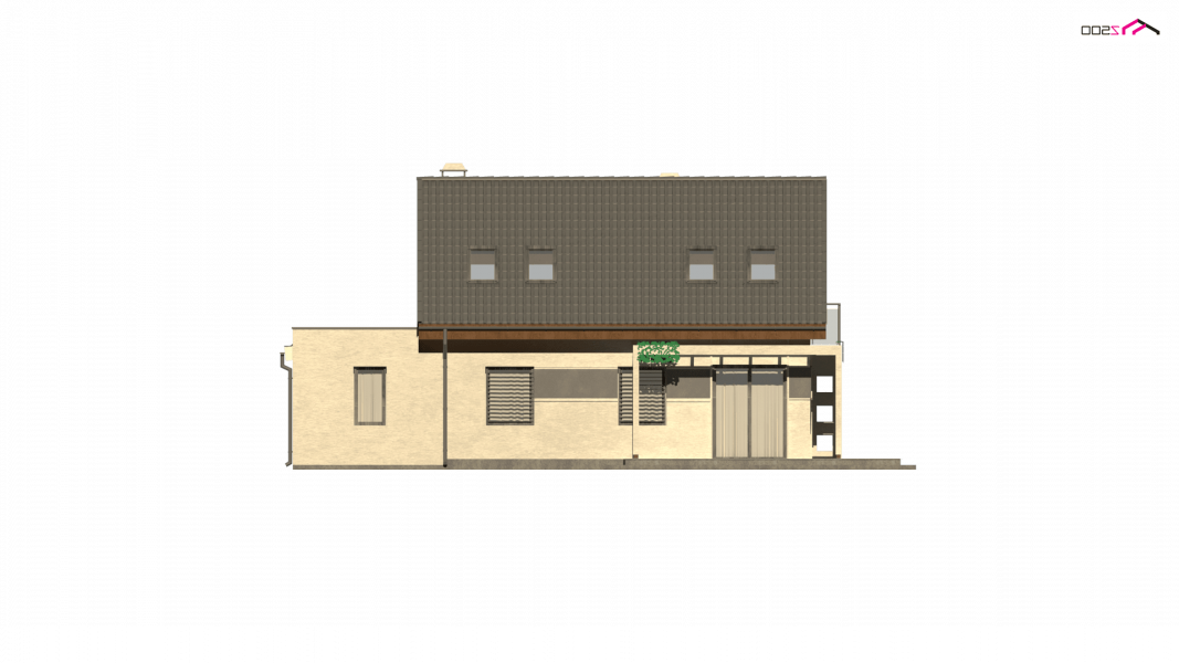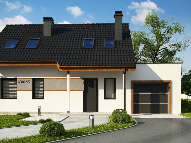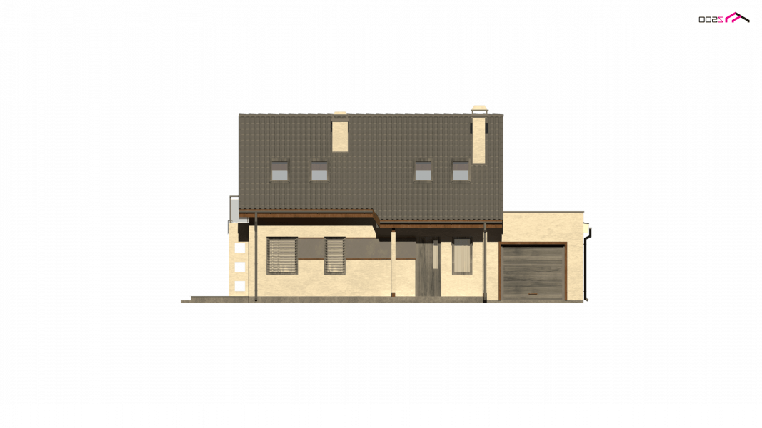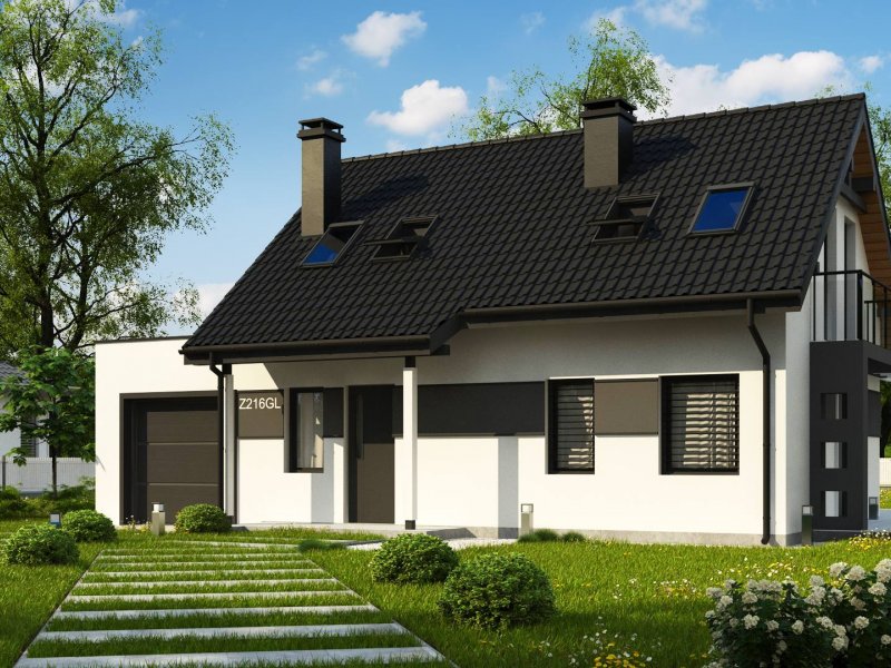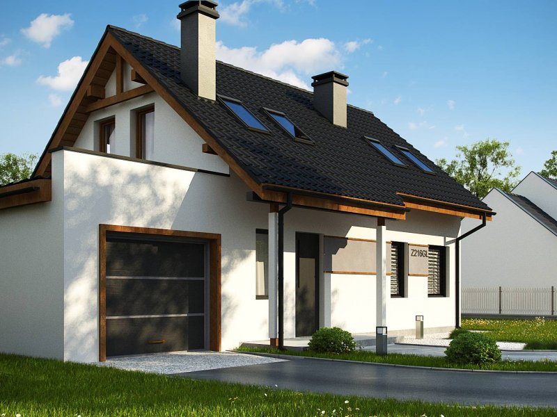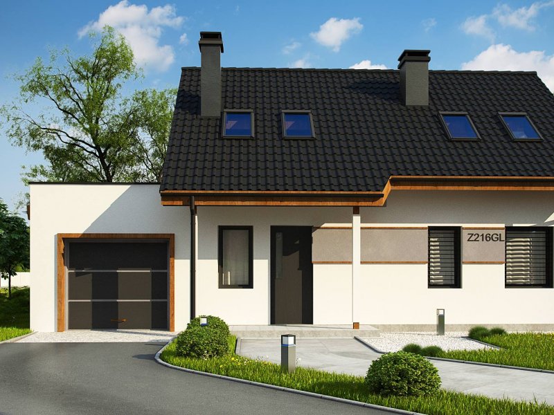 Z 216 GL posiada zadaszone wejście które prowadzi do wygodnej sieni z miejscem na sporą szafę. Strefa dzienna, to przede wszystkim jasny, przestronny salon. Otwarta kuchnia z praktyczną spiżarkę na wszystkie podręczne produkty. Szerokie wyjście balkonowe prowadzi na obszerny, częściowo zadaszony taras. Parter stanowi również wygodny pokój gościnny oraz funkcjonalna łazienka. Piętro to część nocna domu. Są tu trzy przestronne sypialnie oraz naturalnie doświetlona, wygodna łazienka. Projekt posiada również garaż z bezpośrednim przejściem do domu.
