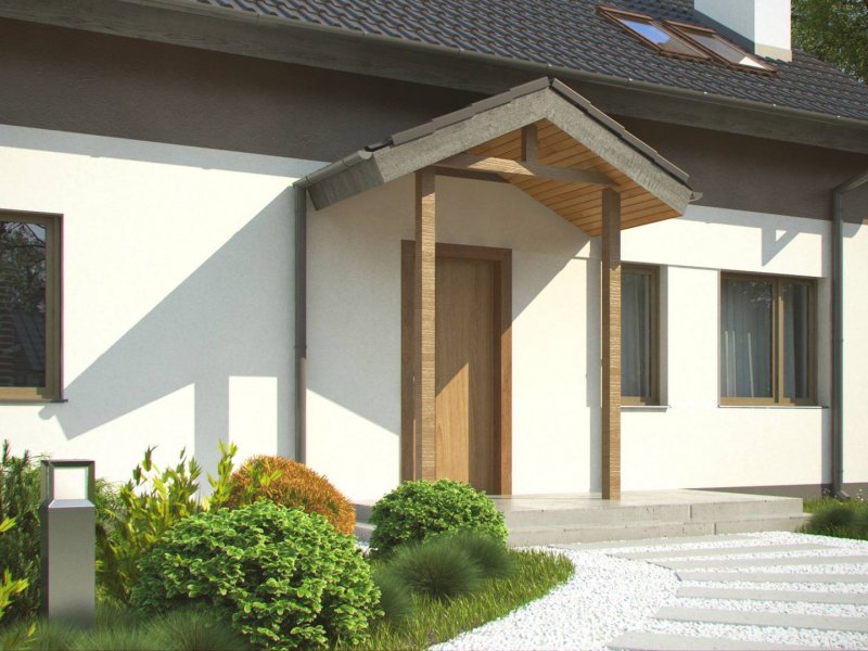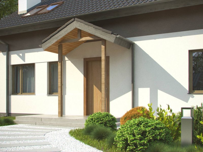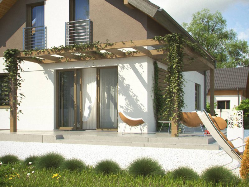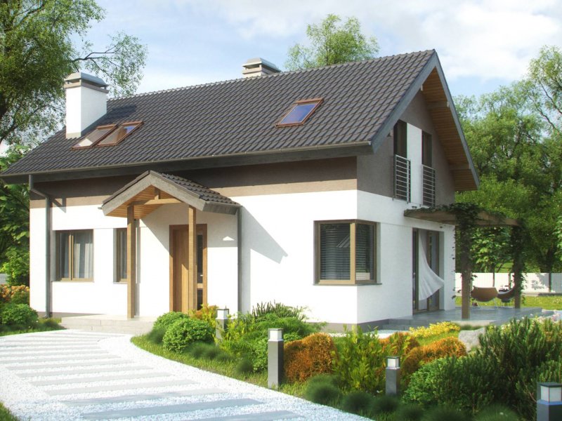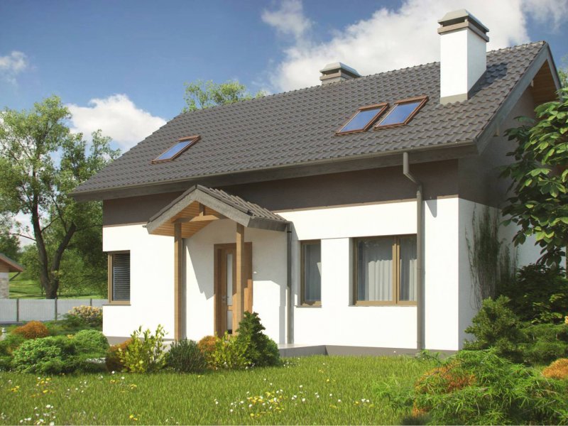 Prosta bryła przykryta dachem dwuspadowym została ciekawie wykończona przez zastosowanie drewnianych elementów które idealnie komponują się z jasnym tynkiem.