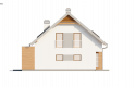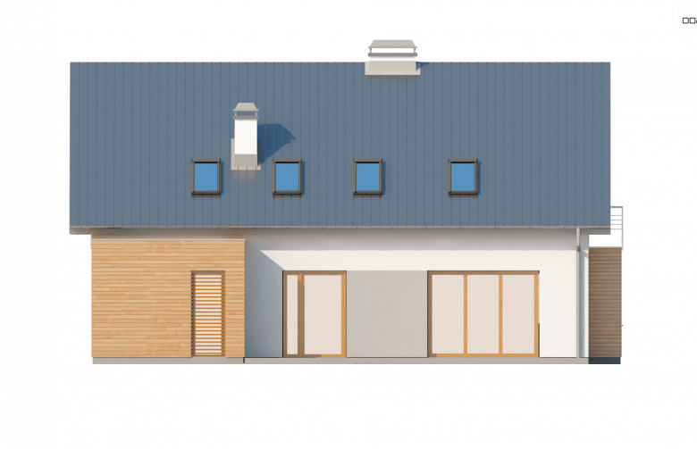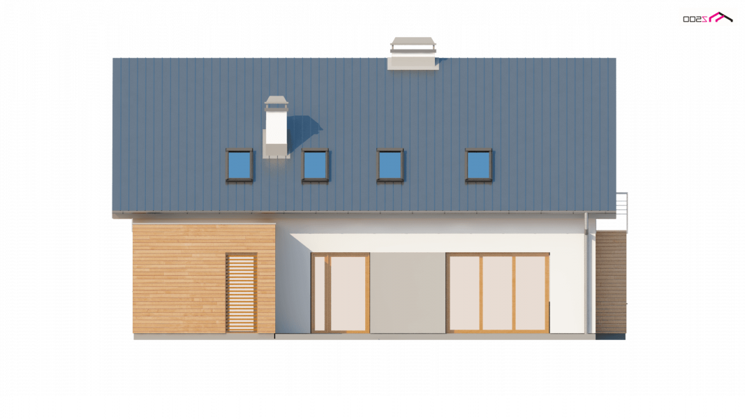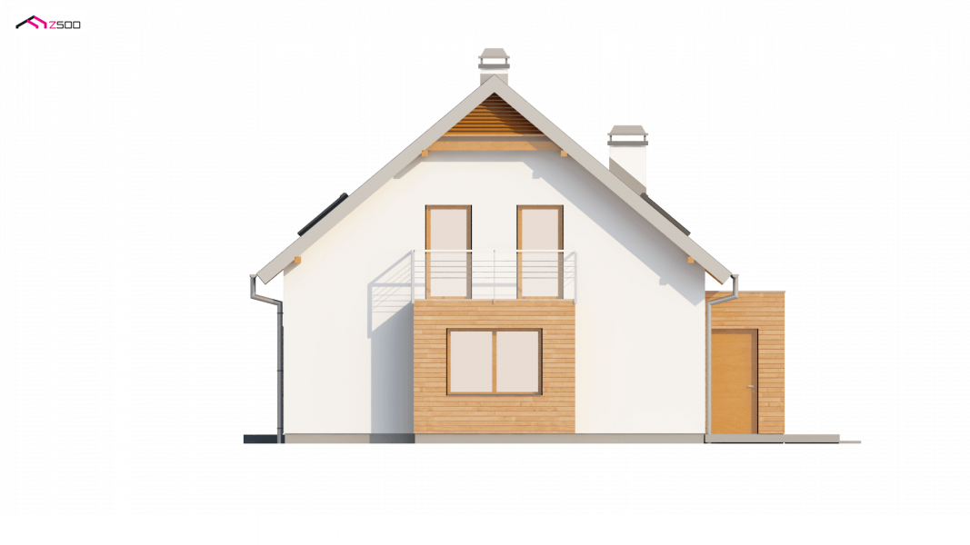 Prostą bryłę domu urozmaica podcień wejściowy oraz wykusz. Wykończenia elewacji z naturalnego drewna dodaje subtelnego uroku. Dom harmonijnie wkomponuje się w każdy krajobraz i typ działki.