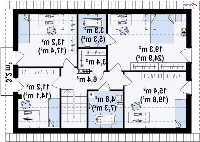 Strefa dzienna w prawej części domu to przestronny salon z jadalnią w wykuszu oraz ustawną kuchnią. Jest tu także dodatkowy pokój z wyjściem na zadaszony taras oraz łazienka z prysznicem. Pod schodami znajduje się mały schowek, który może również pełnić rolę spiżarni. Duże pomieszczenie gospodarcze dostępne jest także z ogrodu, co podnosi komfort jego użytkowania. Strefa nocna na poddaszu to 4 obszerne sypialnie, garderoba oraz ogólnodostępna łazienka. Dwa pokoje posiadają wyjście na mały taras nad wykuszem jadalni, a główna sypialnia została dodatkowo wyposażona we własną łazienkę.