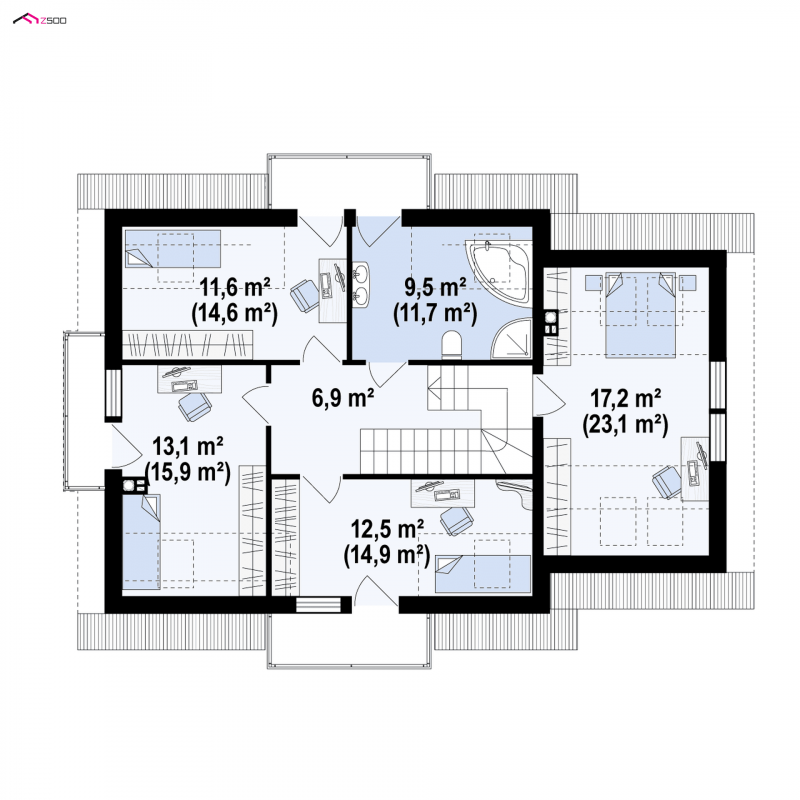 Powierzchnie parteru stanowi wygodny, przestronny salon połączony jednoprzestrzennie z jadalnią i częściowo z kuchnią. Niewielka łazienka została zlokalizowana obok pokoju, który może służyć jako gabinet bądź pokój gościnny. Strefę wejściową stanowi sień z wydzielonym miejscem na szafę, stąd też można dostać się przez garderobę do garażu, na którego tyłach znajduje się pomieszczenie gospodarcze. Poddasze to strefa nocna domu. Zlokalizowano tu dużą łazienkę, która pomieści wannę i prysznic oraz cztery wygodne sypialnie.