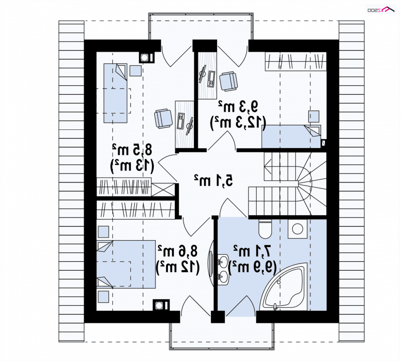 Poddasze to część nocna domu. Znajdują się tu 3 wygodne sypialnie, wszystkie z wyjściem na balkon oraz łazienka.