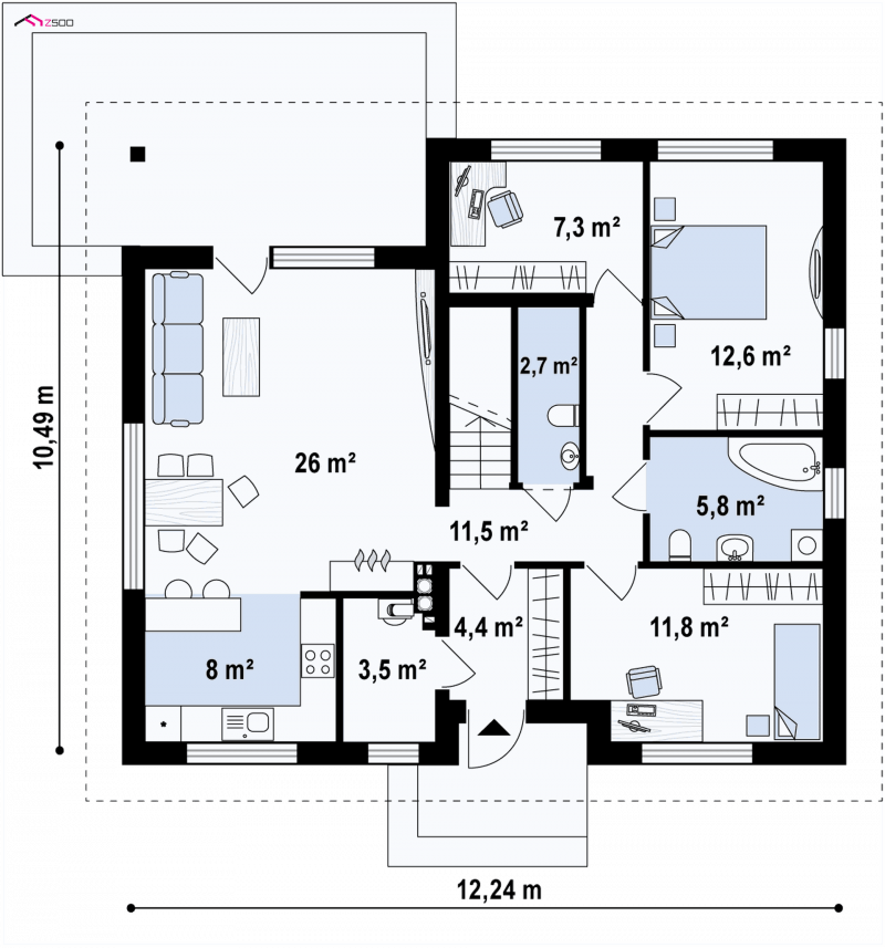 Zaletą projektu jest prosta konstrukcja - tylko jedna ściana konstrukcyjna wewnątrz pozwala na niemal dowolną aranżację wnętrza.