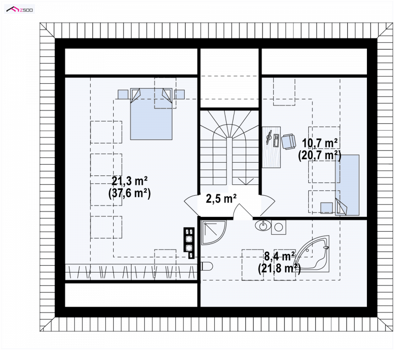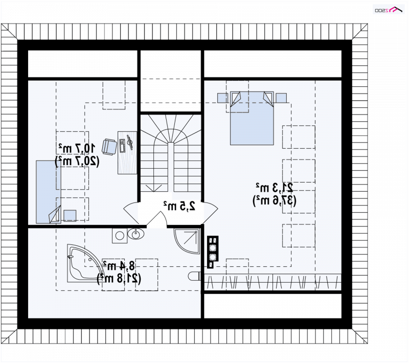 Poddasze to dwa dodatkowa dodatkowe pokoje oraz duża przestronna łazienka. Pomieszczenia zostały doświetlone oknami dachowymi.