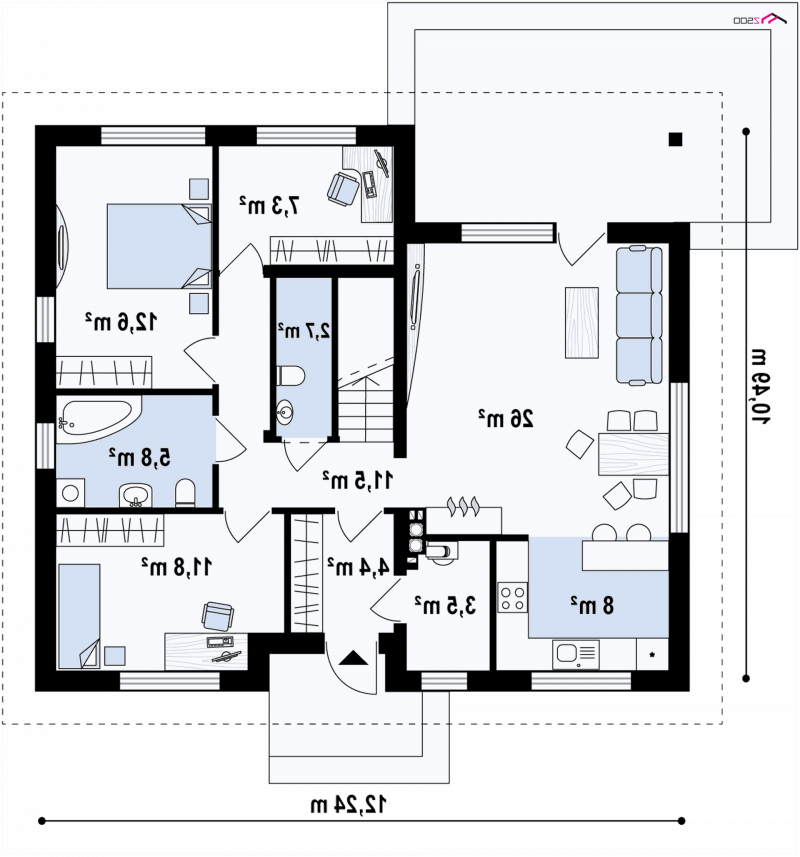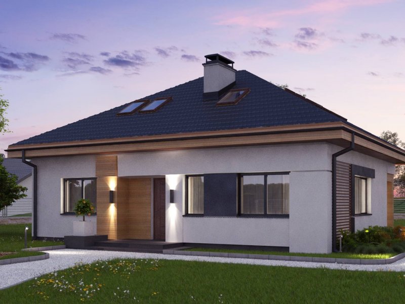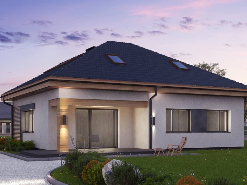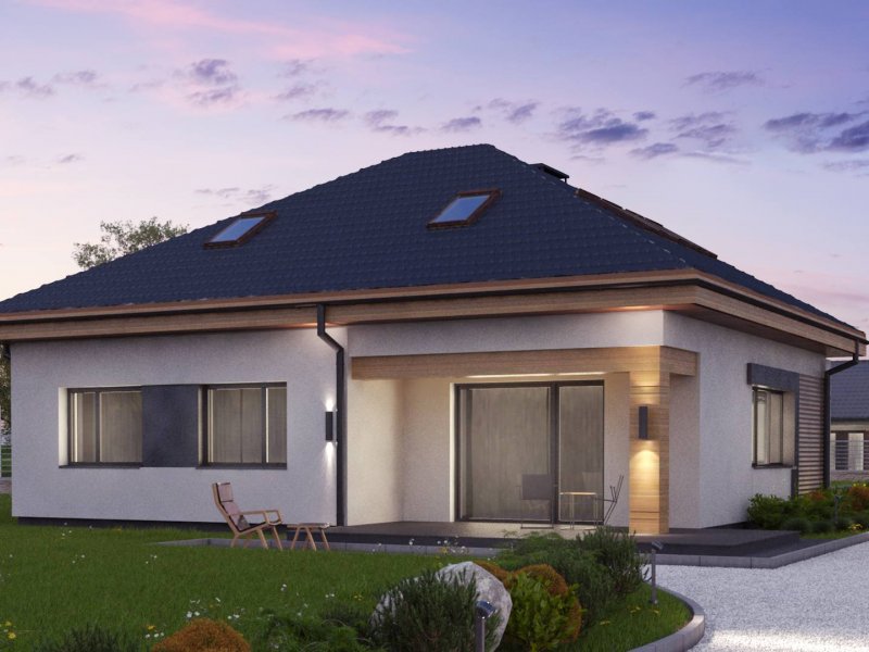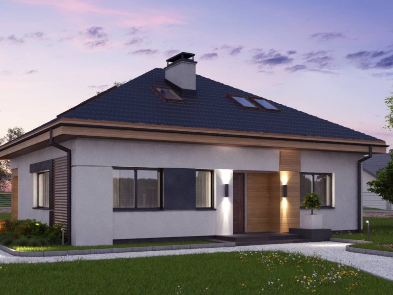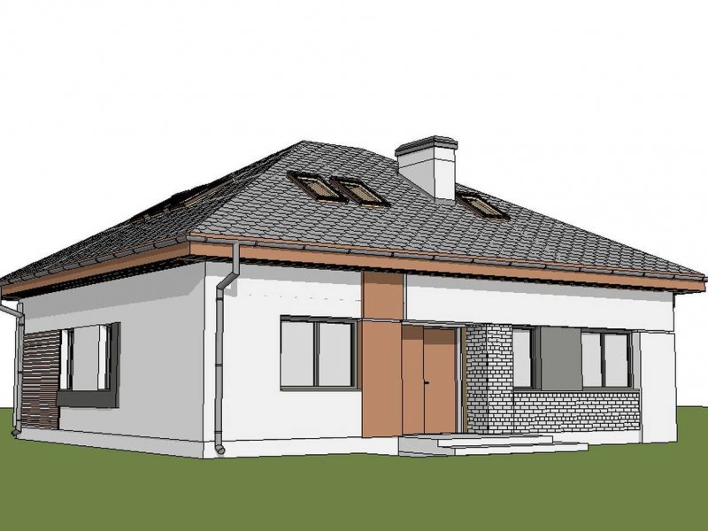 Do domu wchodzimy z podcienia wejściowego. W sieni zaplanowano miejsce na pojemną szafę. Dalej możemy dostać się na lewo do części reprezentacyjnej lub na prawo do strefy prywatnej domowników. Część dzienna to komfortowy salon z jadalnią, centralnie umieszczonym kominkiem, dużymi przeszkleniami oraz wyjściem na zadaszony taras. Całość dopełnia ustawna, wygodna kuchnia. W drugiej części domu zaprojektowano trzy podobnej wielkości pokoje. Dwie łazienki podniosą komfort użytkowania. Duża z oknem, mniejszą w razie potrzeby można zamienić na garderobę, spiżarnię czy podręczny schowek.