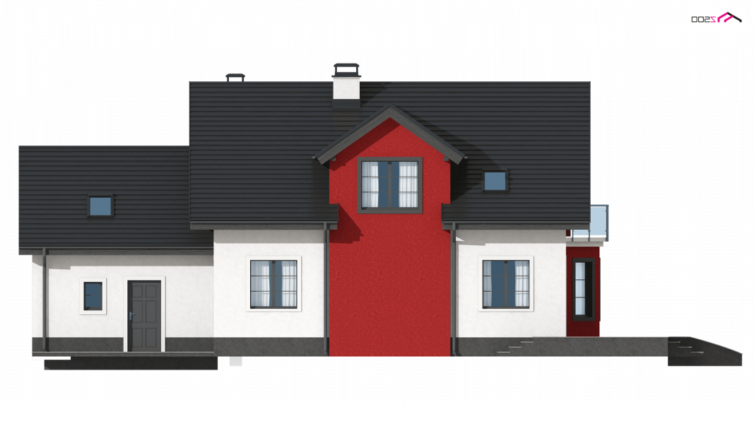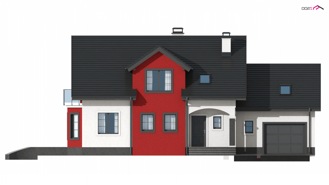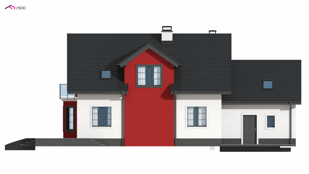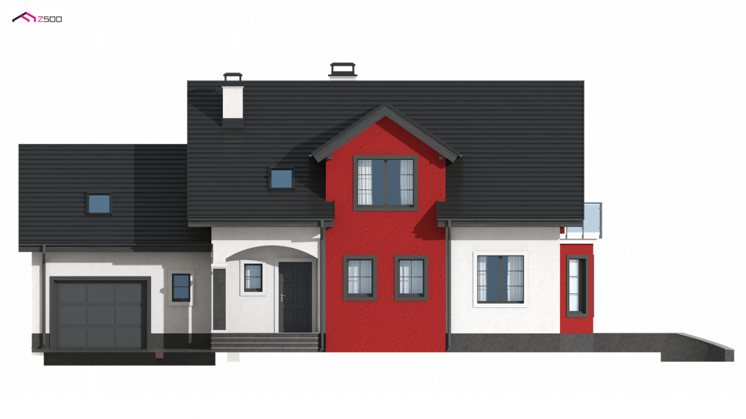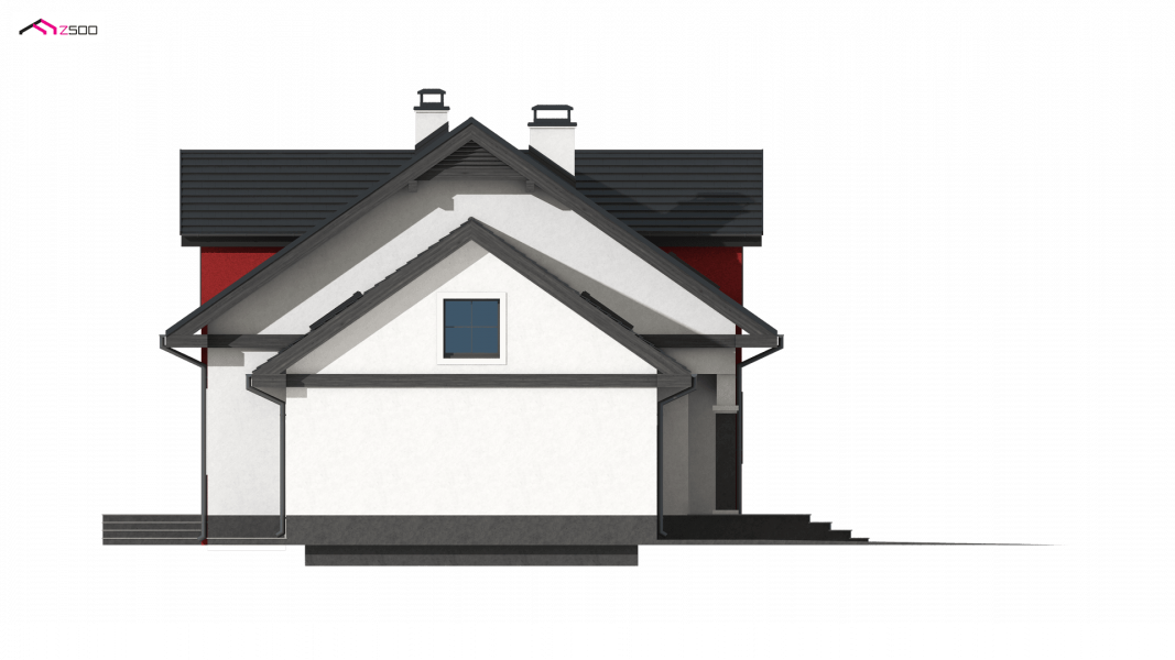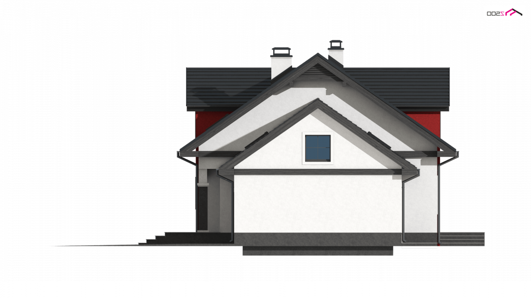 Podwariant domu z28 powiększony o garaż jednostanowiskowy z lewej strony. W tej wersji zyskujemy połączenie garażu z domem poprzez pomieszczenie gospodarcze jak również półpiętro - przestrzeń nad garażem jest do zagospodarowania np jako strych lub pomieszczenie rekreacyjne. Schody również zostały zmodyfikowane tj. powiększone o duży spocznik, dzięki czemu są wygodne i nie powodują kolizji przy korzystaniu z pomieszczenia nad garażem.