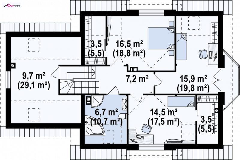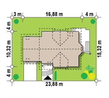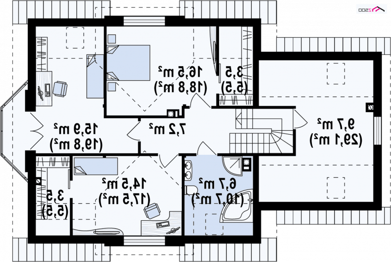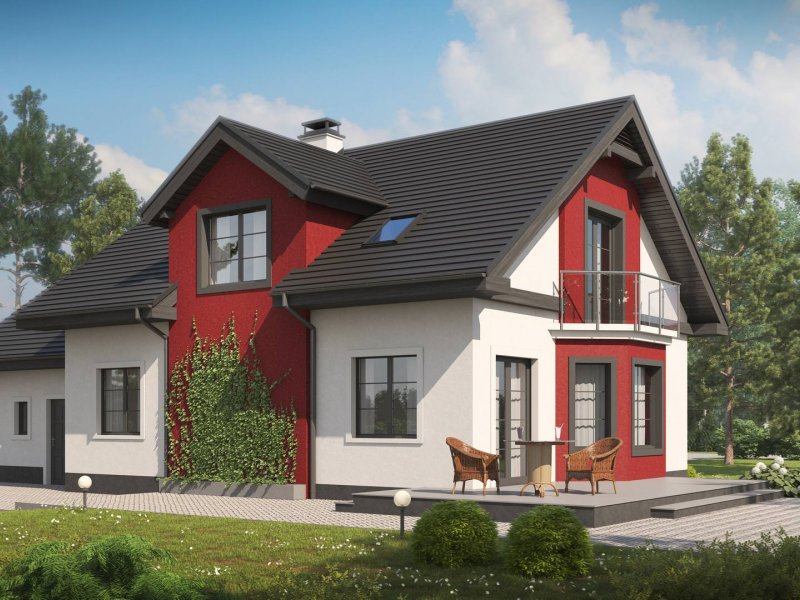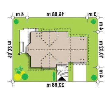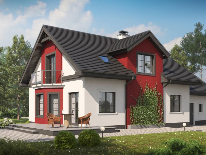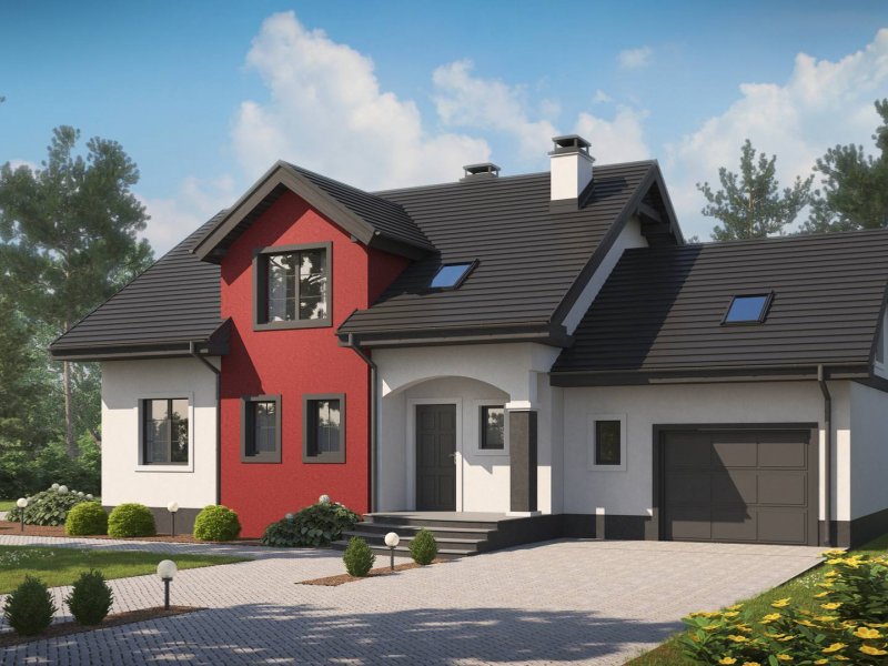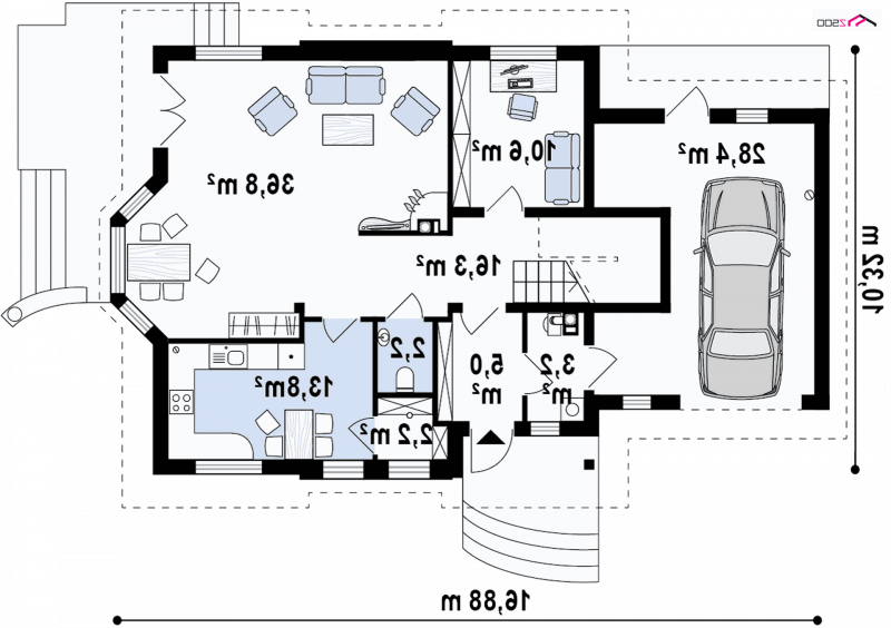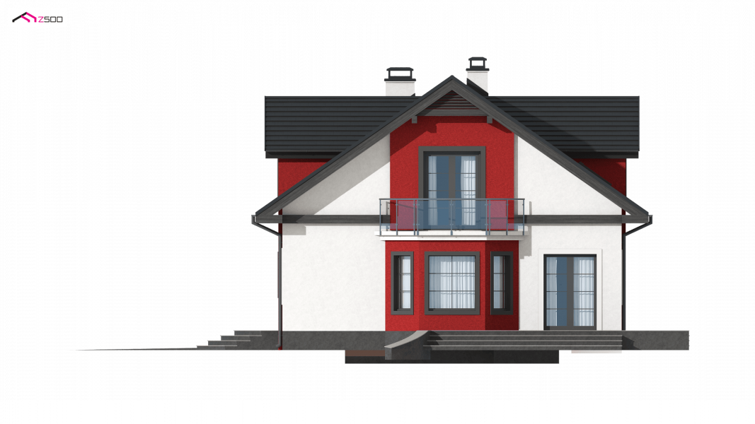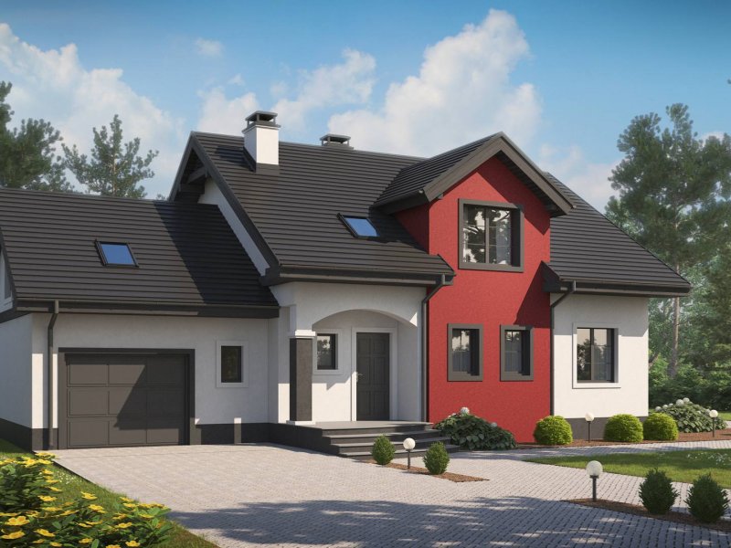 Podwariant domu z28 powiększony o garaż jednostanowiskowy z lewej strony. W tej wersji zyskujemy połączenie garażu z domem poprzez pomieszczenie gospodarcze jak również półpiętro - przestrzeń nad garażem jest do zagospodarowania np jako strych lub pomieszczenie rekreacyjne. Schody również zostały zmodyfikowane tj. powiększone o duży spocznik, dzięki czemu są wygodne i nie powodują kolizji przy korzystaniu z pomieszczenia nad garażem.
