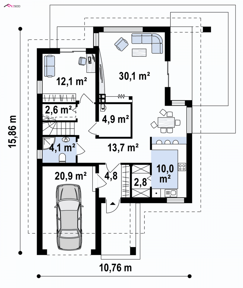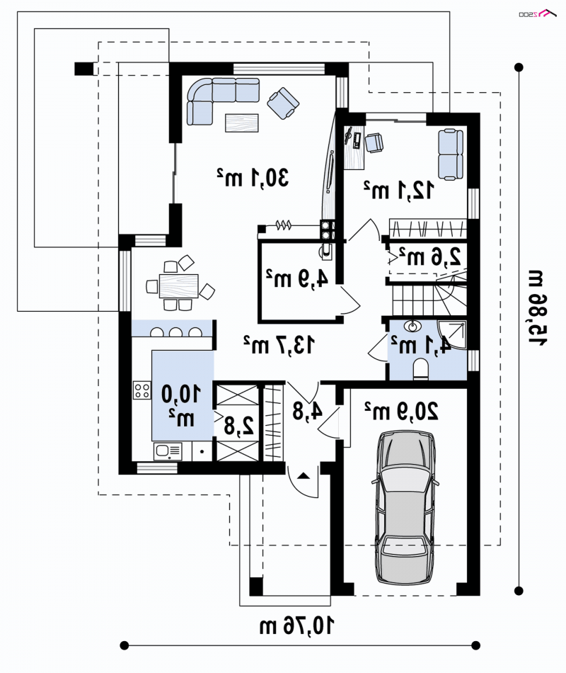 Z288 to propozycja dla osób poszukujących przestronnego domu jednorodzinnego o urozmaiconej bryle z wielospadowym dachem.