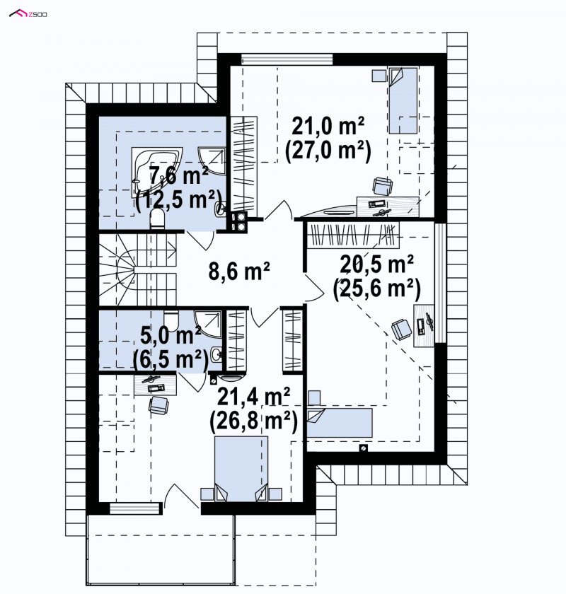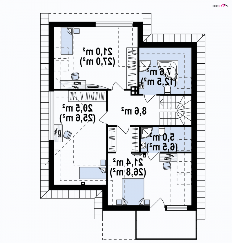 Poddasze z trzema sypialniami i dwoma łazienkami w pełni zaspokoi potrzeby nawet wieloosobowej rodziny. W przypadku mniejszej liczby mieszkańców liczbę sypialni na poddaszu można zmniejszyć uzyskując dodatkową przestrzeń na jedną lub dwie garderoby. Podobnie w strefie parteru likwidując dodatkowy pokój można powiększyć strefę dzienną lub utworzyć, oddzielony od pokoju dziennego jedynie przesuwną przegrodą, pokój telewizyjny lub bawialnię. Projekt pozwala jak widać na elastyczne zmiany układu wewnętrznego. Może okazać się to cenne wraz z upływem lat gdy wraz z wiekiem członków rodziny zmienia się sposób wykorzystania przestrzeni. Dzięki zastosowaniu ramy stalowej słupy nie wypadają na środku pokoju jak to ma miejsce przy innych wielospadowych dachach.