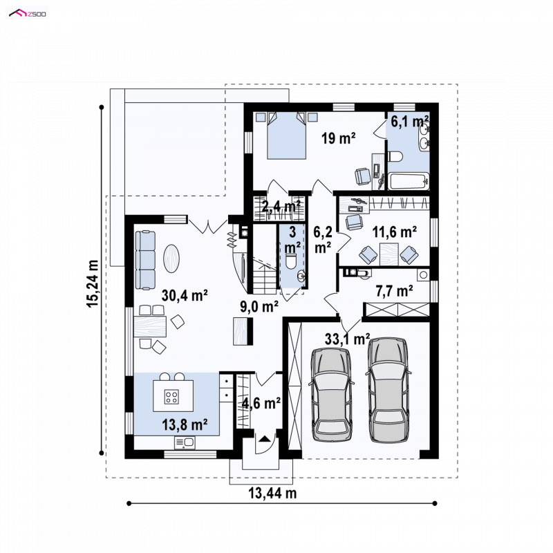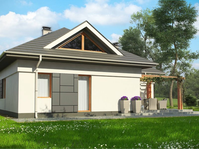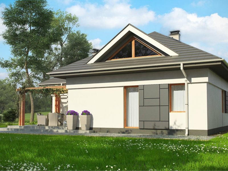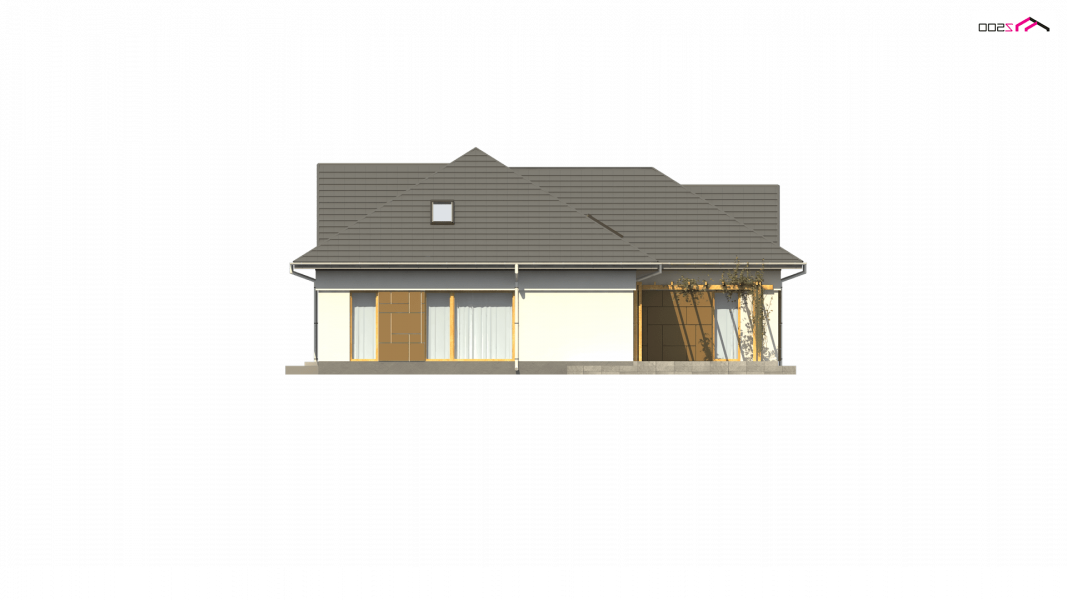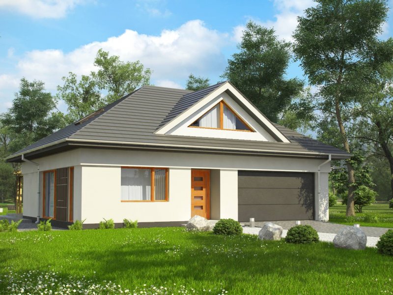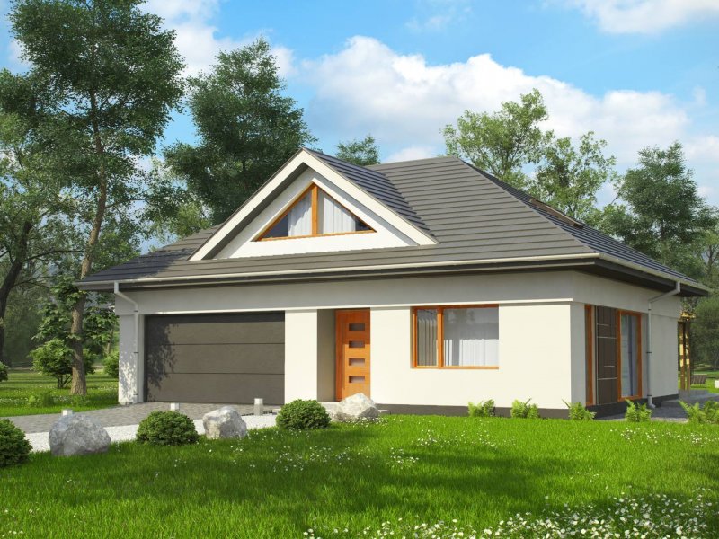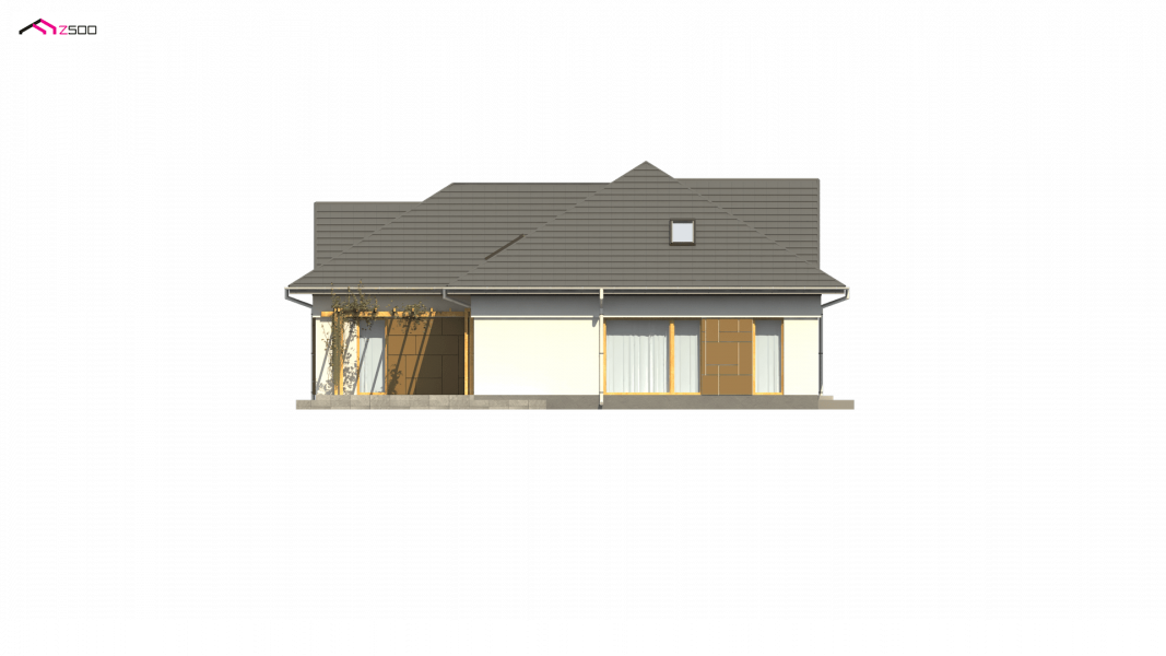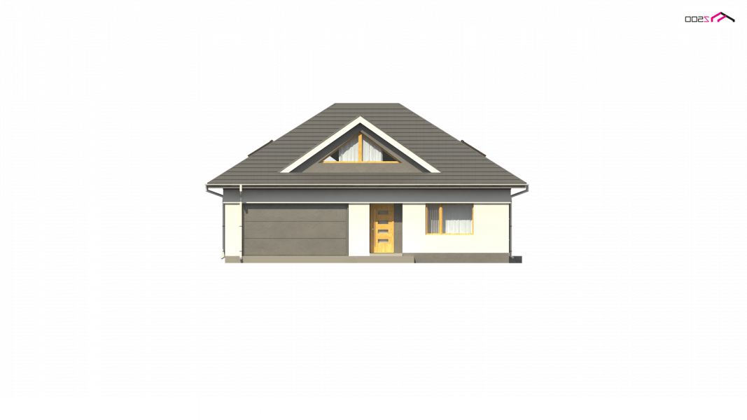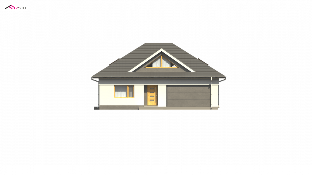 Z306 to zgrabny projekt domu z poddaszem użytkowym i dwustanowiskowym garażem w bryle. Jasna stolarka okienna oraz szare okładziny elewacyjne nadają nowoczesny wygląd.