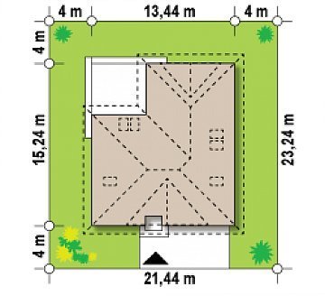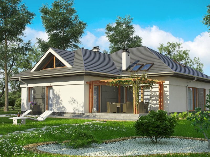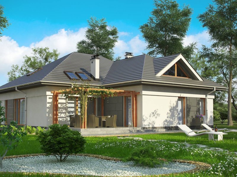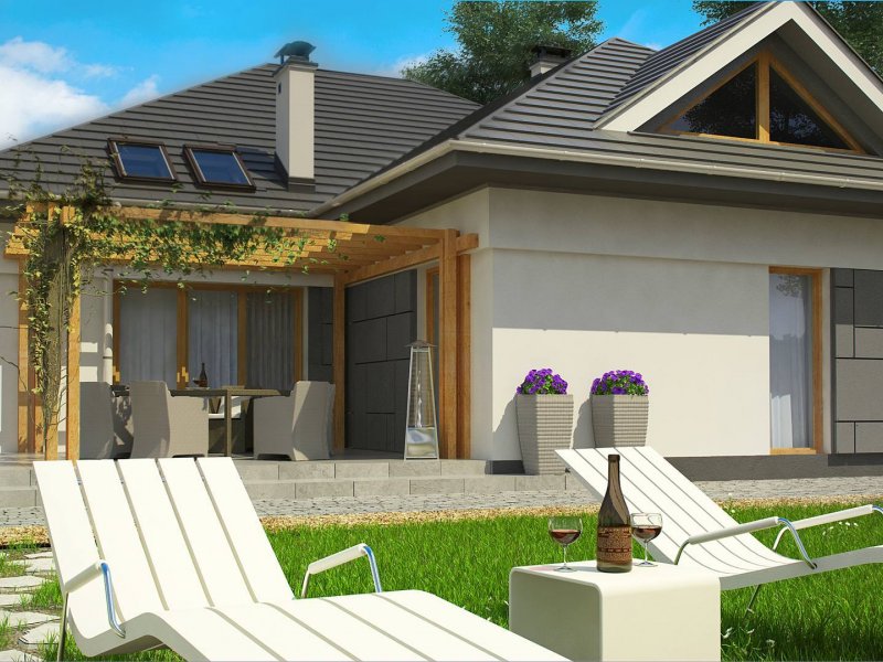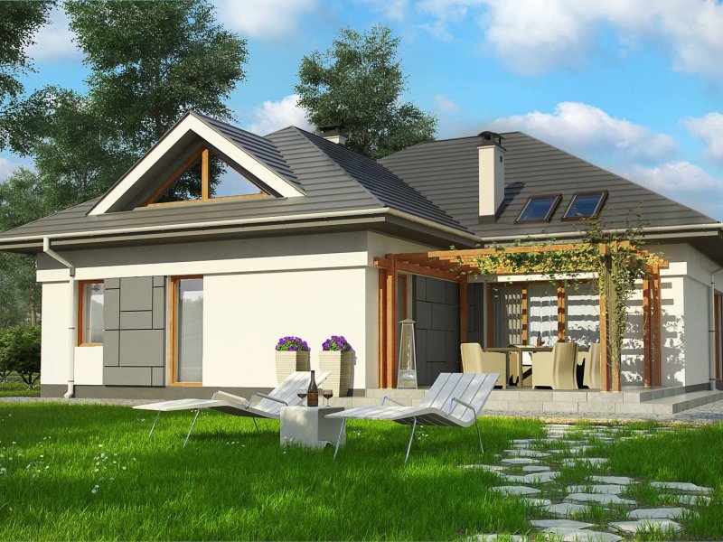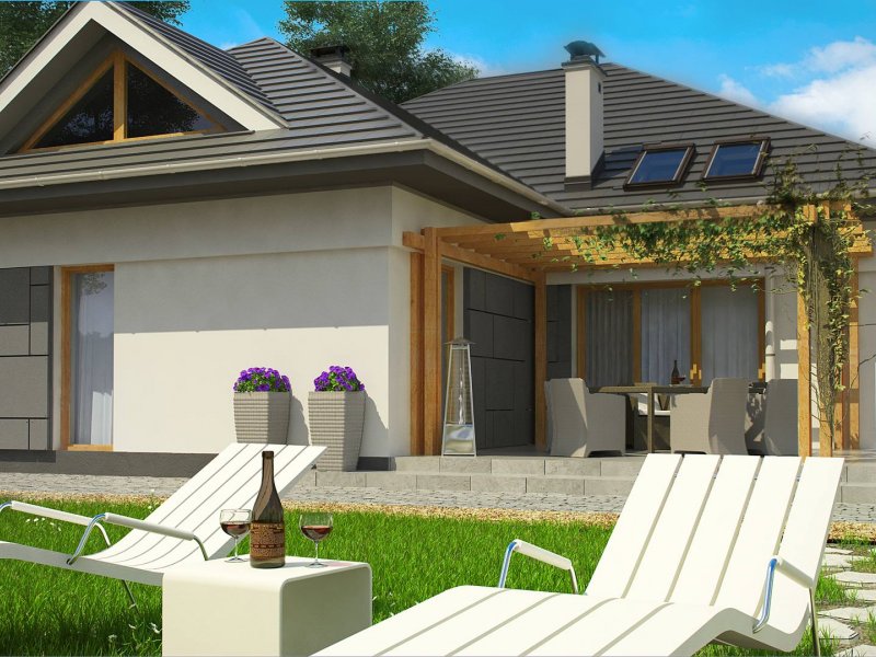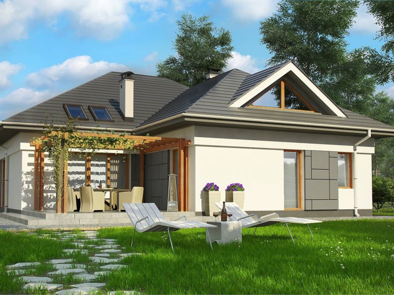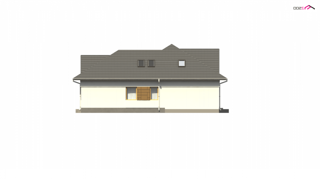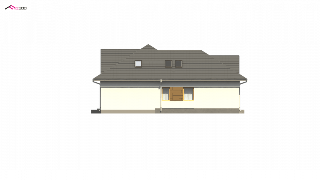 Zadaszone wejście prowadzi do wygodnej sieni z miejscem na sporą szafę. Strefa dzienna, to przede wszystkim jasny, obszerny salon połączony z dużą kuchnią w której znalazło się miejsce na wyspę. Kolejną zaletą tego domu jest intymnie ulokowany gabinet, sprawdzi się również doskonale jako pokój gościnny. Na parterze została zaprojektowana sypialnia rodziców z własną łazienką i garderobą.