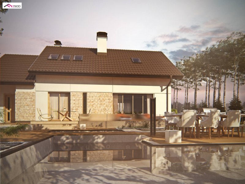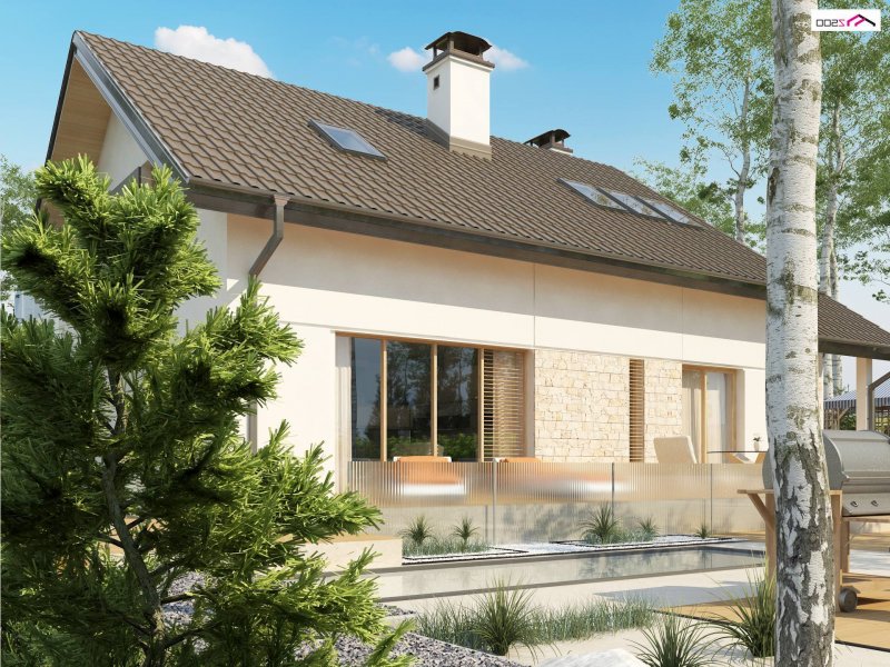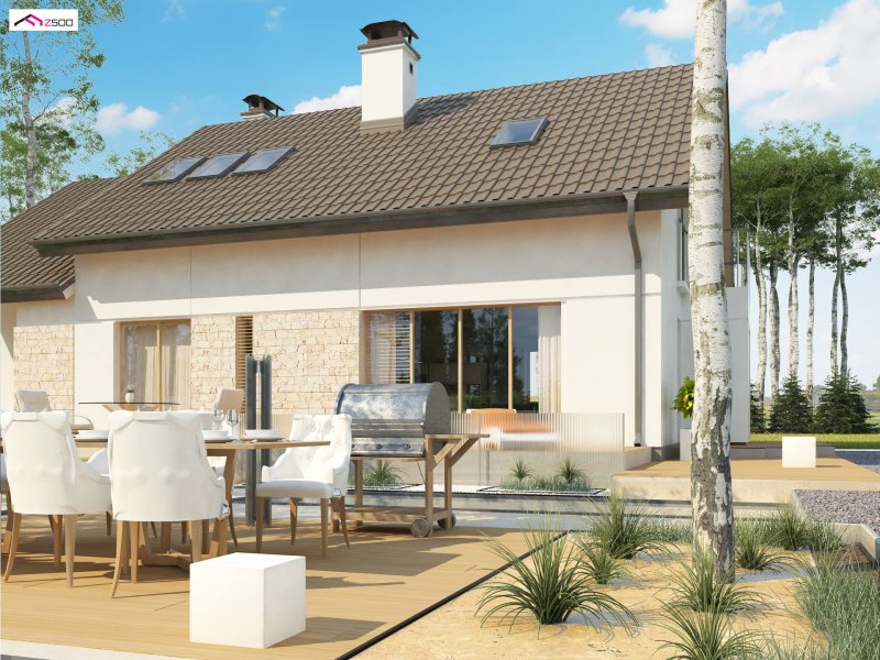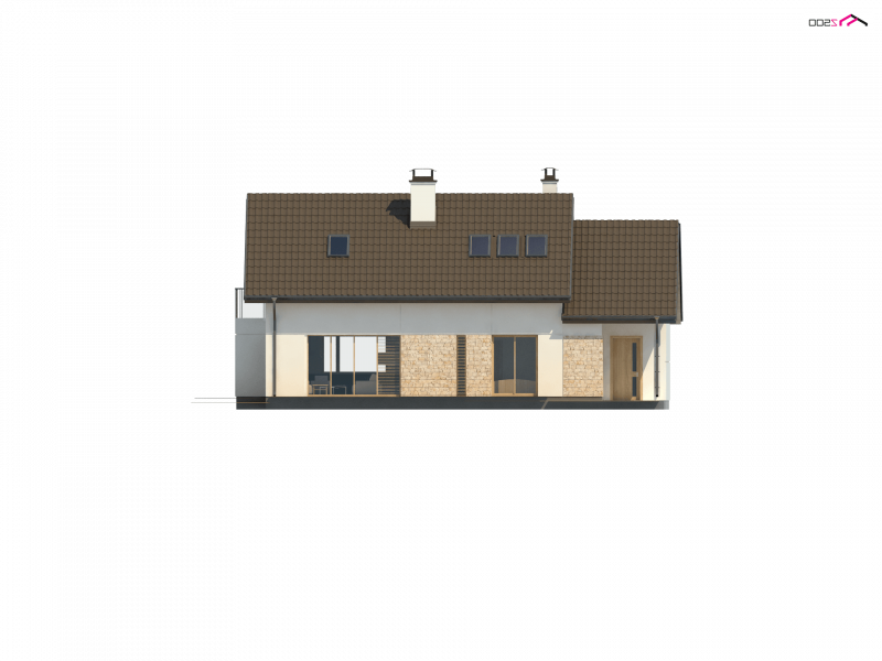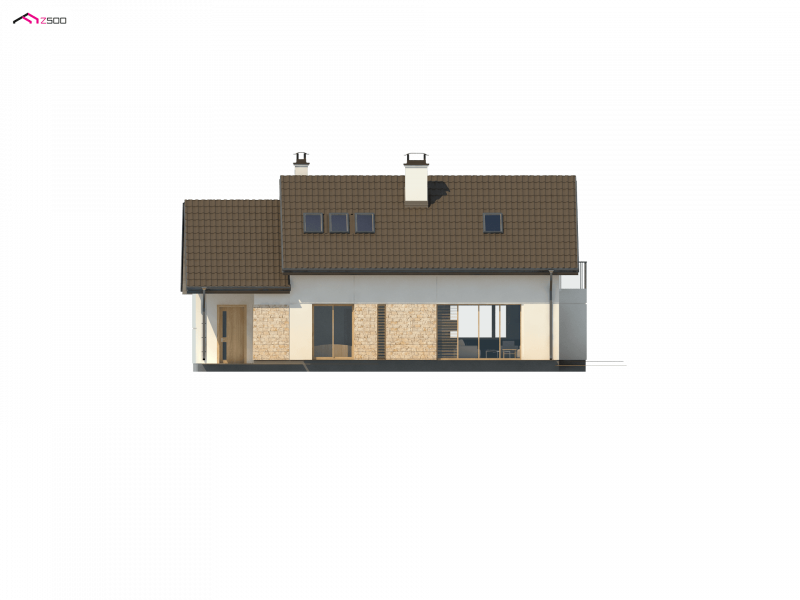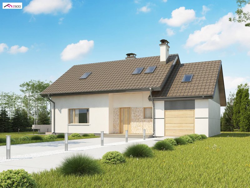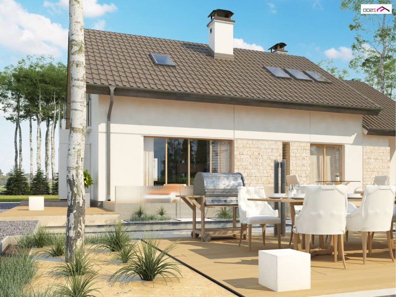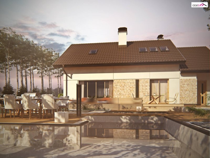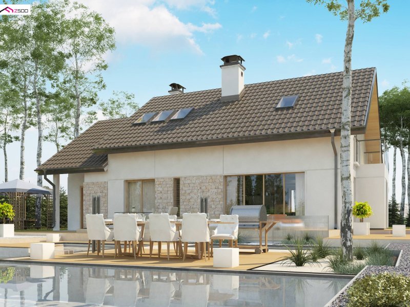 Ten dom spodoba się zarówno osobom lubiącym styl tradycyjny domu jak i nowoczesny. Prosta elewacja urozmaicona częściowo kamieniem jest najlepszym pomysłem dla ludzi ceniących lekką elegancję.