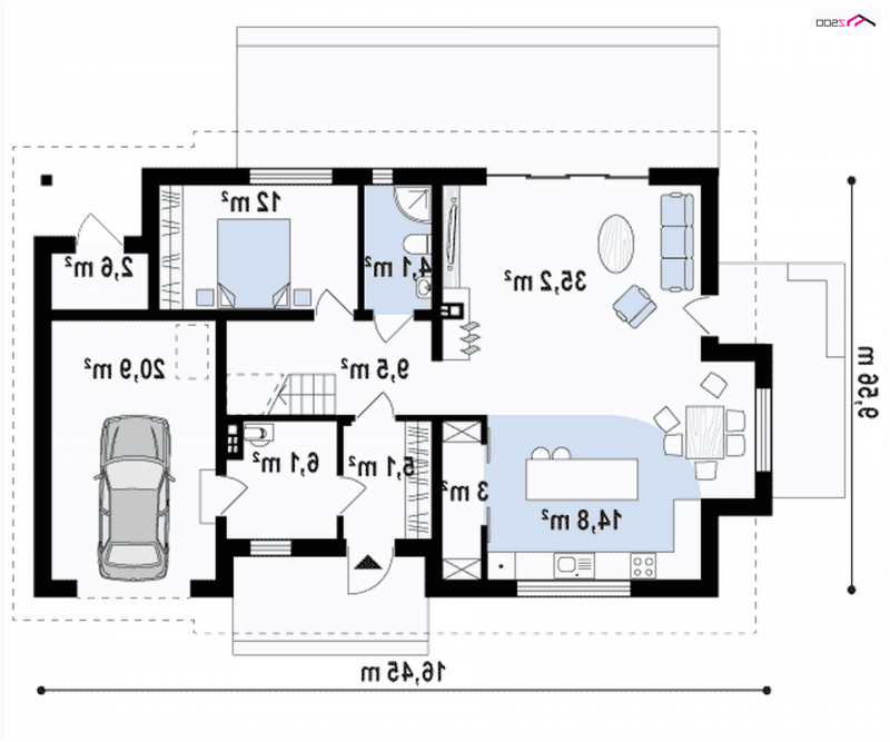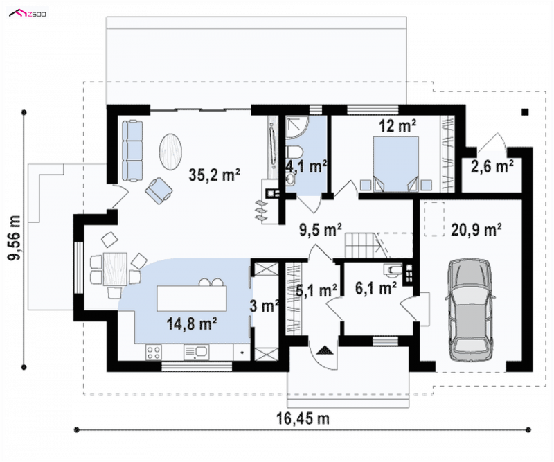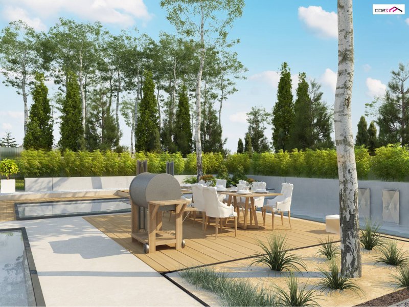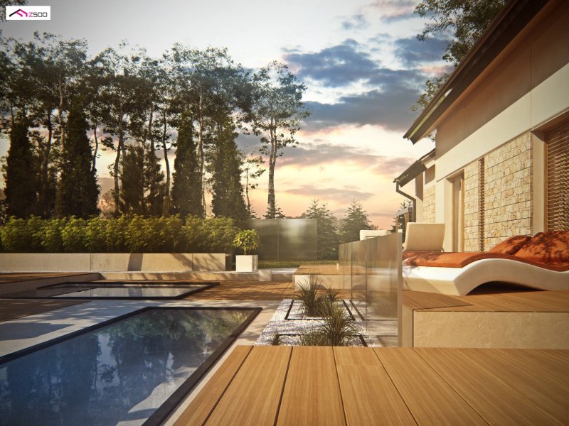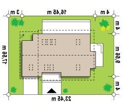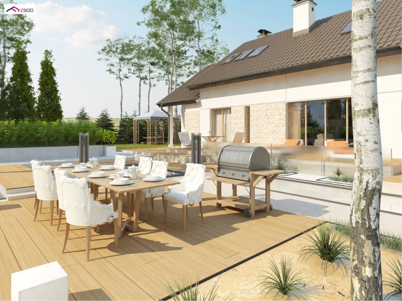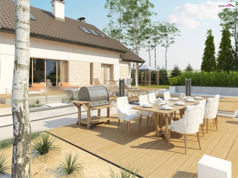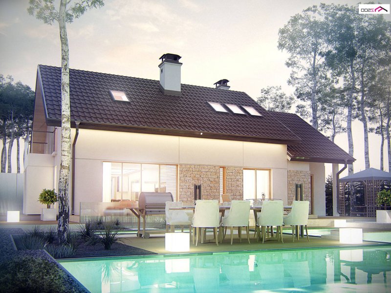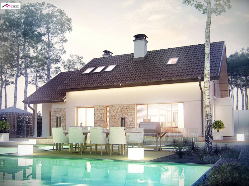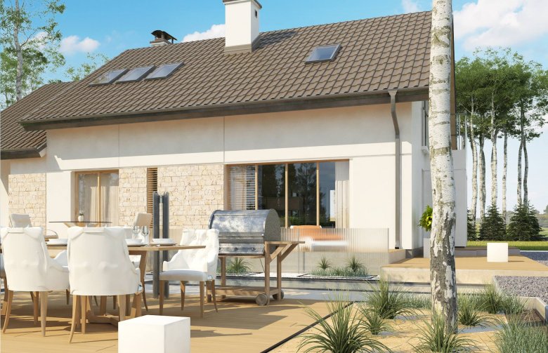 Ten dom spodoba się zarówno osobom lubiącym styl tradycyjny domu jak i nowoczesny. Prosta elewacja urozmaicona częściowo kamieniem jest najlepszym pomysłem dla ludzi ceniących lekką elegancję.