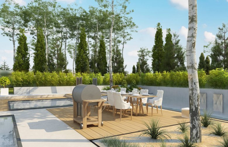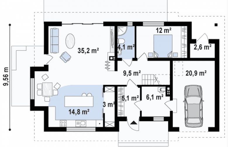 Wnętrze posiada obszerny salon połączony bezpośrednio z kuchnią i jadalnią. Do domu można wejść przez garaż, łatwo dostępne jest także pomieszczenie gospodarcze. Na parterze znajduje się także gabinet lub ewentualnie pokój gościnny.