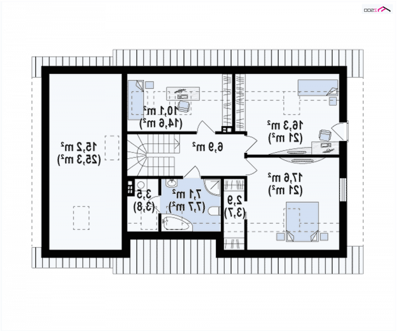 Na poddaszu znajdują się trzy duże pokoje, w tym jeden największy zawiera garderobę. Znajduje się przy nich łazienka połączona z pralnią. Atutem domu na pewno jest wysoka ścianka kolankowa oraz strych, który znajduje się nad garażem, jest dobrym miejscem na przechowywanie sezonowych rzeczy.