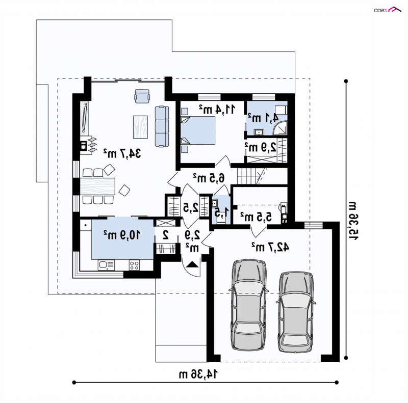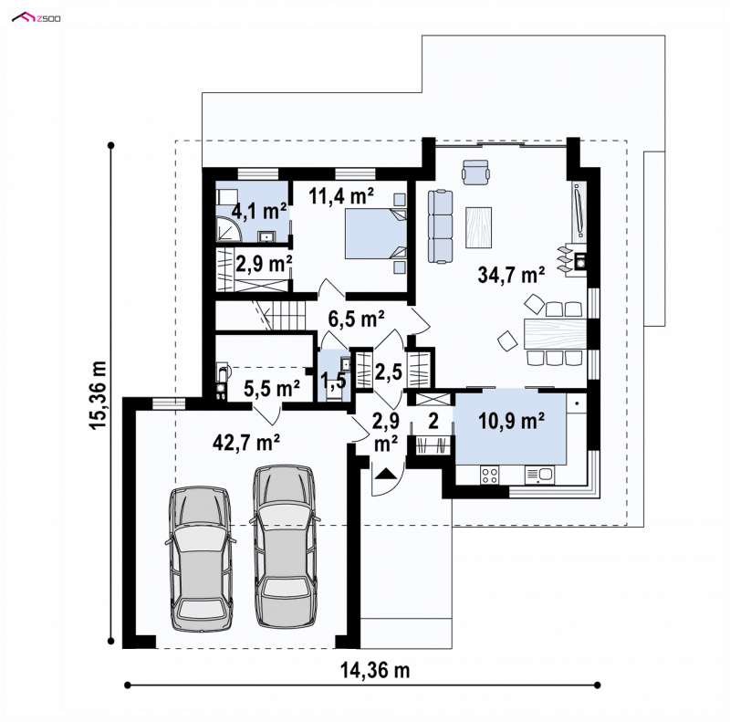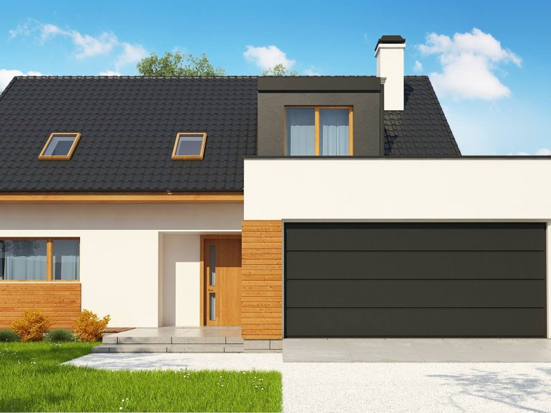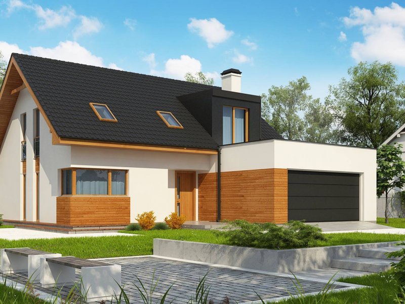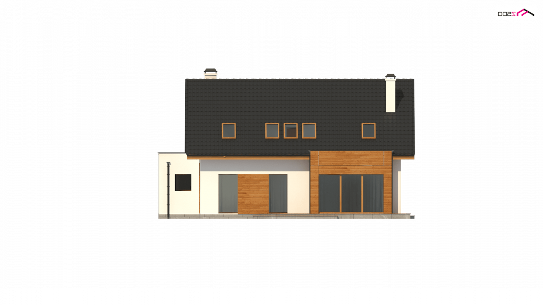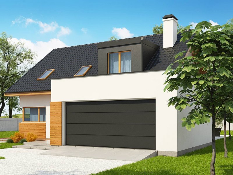 Projekt Z320 jest dużym, ok. 160 metrowym domem dwupoziomowym. Dwustanowiskowy garaż znajdujący się poza bryłą budynku został wysunięty od strony frontu tak, aby dzięki temu zajmował mniejszą szerokość działki. Nad garażem istnieje możliwość zrobienia tarasu, na który prowadzi wyjście z lukarny, natomiast z sieni mamy bezpośrednie wejście do garażu, by nie trzeba było go otwierać z zewnątrz aby dostać się do samochodu.