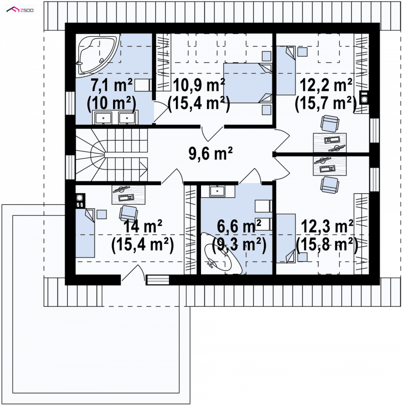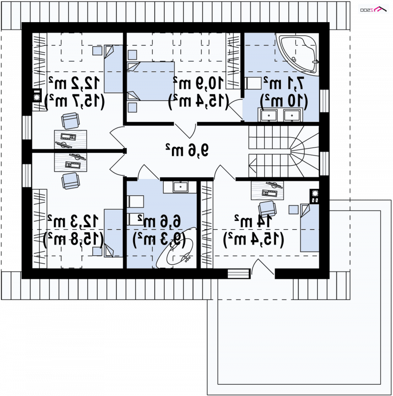 Góra stanowi część nocną domu i znajdują się w niej 4 pokoje i dwie łazienki. Pomieszczenia te możemy przeznaczyć na sypialnię z łazienką oraz na pokoje dla dzieci. Jeden z pokoi może mieć wyjście na taras. Stanowi to dodatkowy atut dla osób kochających kąpiele słoneczne.