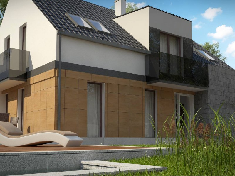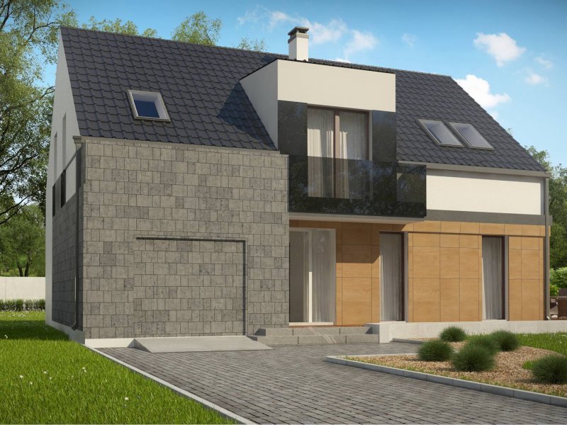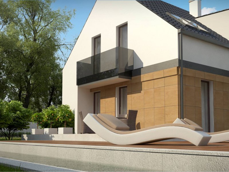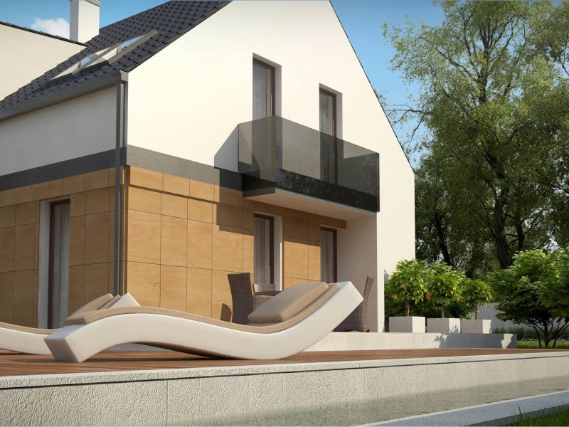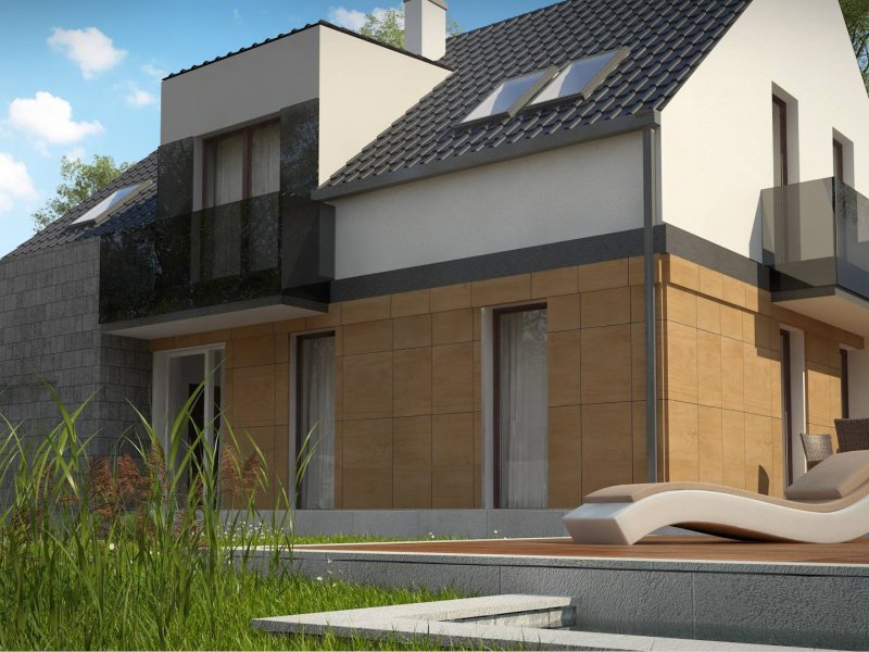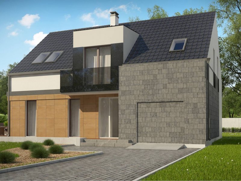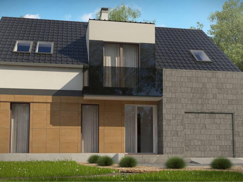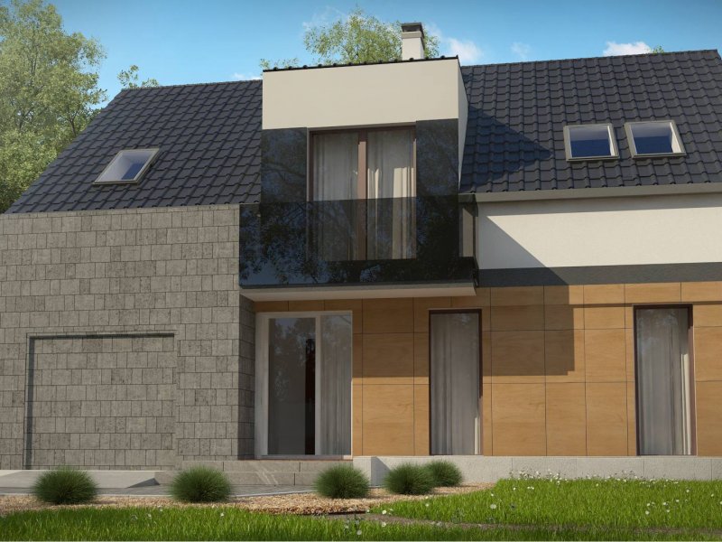 Połączenie bieli i brązu z szarością płytek elewacyjnych na wysuniętej bryle jednostanowiskowego garażu wyróżnia budynek spośród innych. Płaska dachówka stanowiąca rozwiązanie, które cechuje prostota wykonania, funkcjonalność, a także wysoka jakość produktu oraz balkon wykończony przyciemnianym szkłem, nadają wyrafinowanego i osobliwego smaku temu domowi.