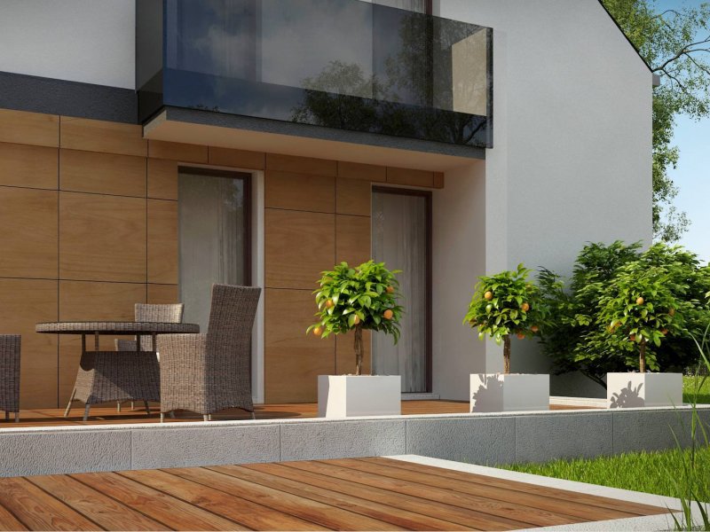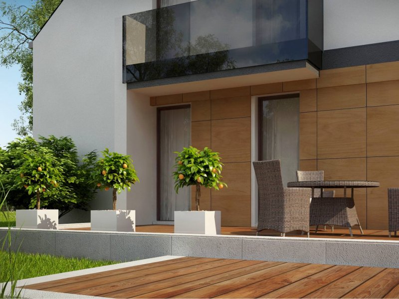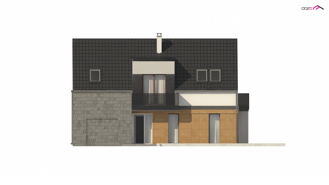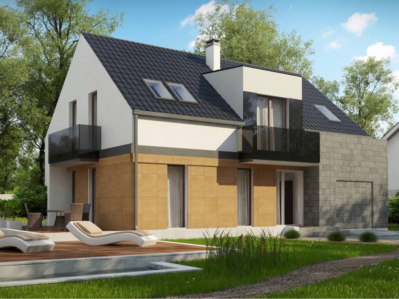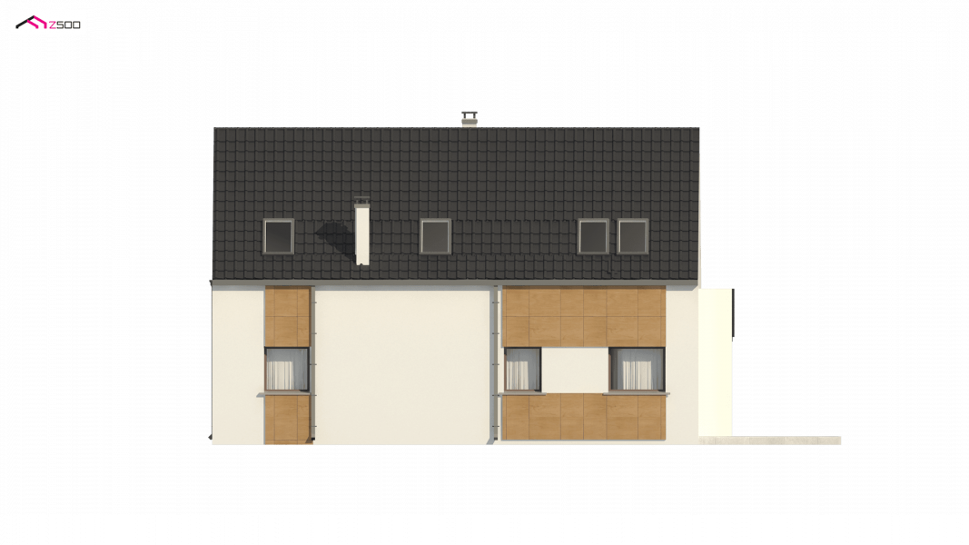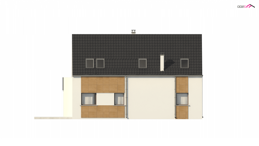 Połączenie bieli i brązu z szarością płytek elewacyjnych na wysuniętej bryle jednostanowiskowego garażu wyróżnia budynek spośród innych. Płaska dachówka stanowiąca rozwiązanie, które cechuje prostota wykonania, funkcjonalność, a także wysoka jakość produktu oraz balkon wykończony przyciemnianym szkłem, nadają wyrafinowanego i osobliwego smaku temu domowi.