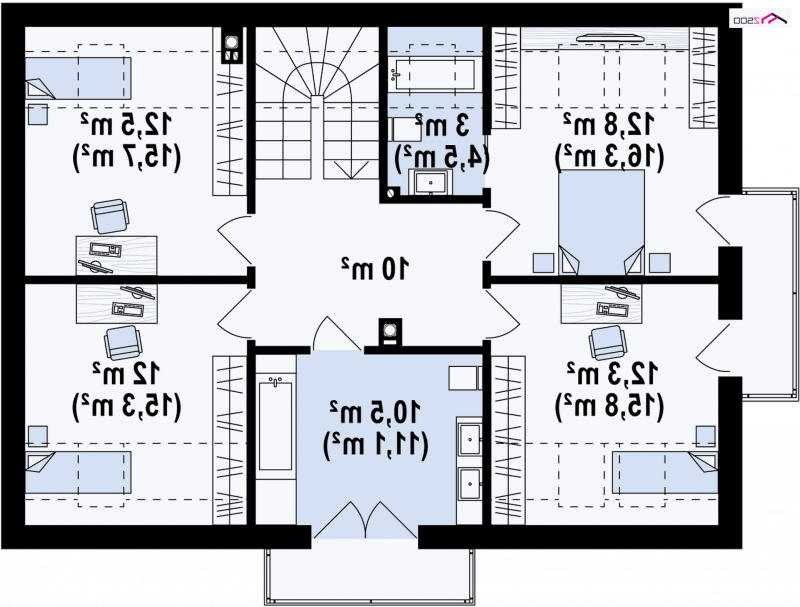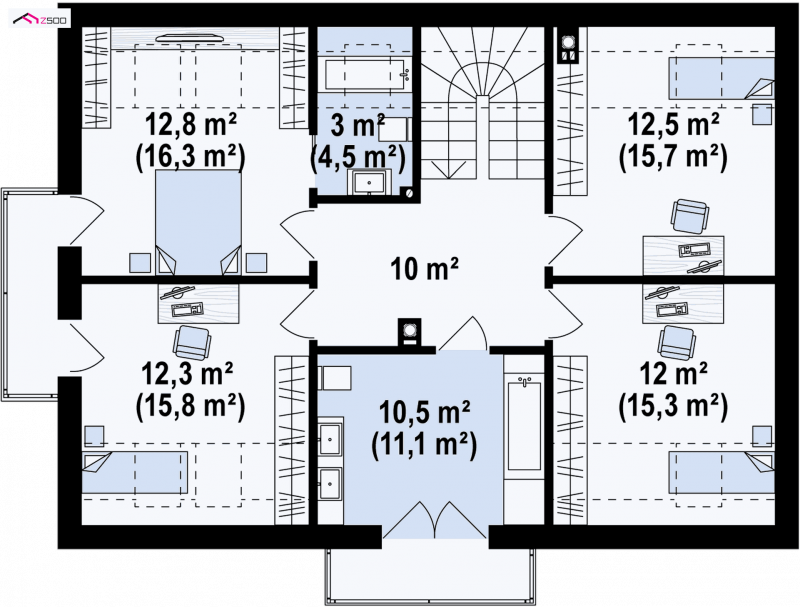 Górne piętro to 4 pokoje stanowiące nocną strefę domu. Zaprojektowano tu dwie łazienki, z których jedna posiada bezpośrednie wyjście na balkon. Zaś dwa pokoje znajdujące się w lewej części domu mają wyjście na wspólny balkon, z którego cieszyć się będą dzieci ale i dorośli nie pozostaną obojętni na walory jakie stanowi możliwość opalania się na własnym tarasie.