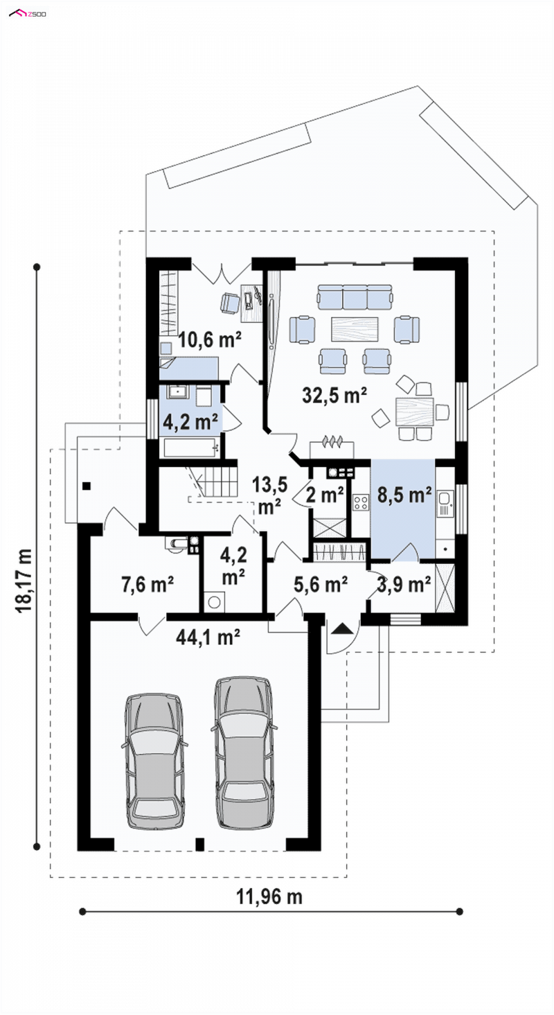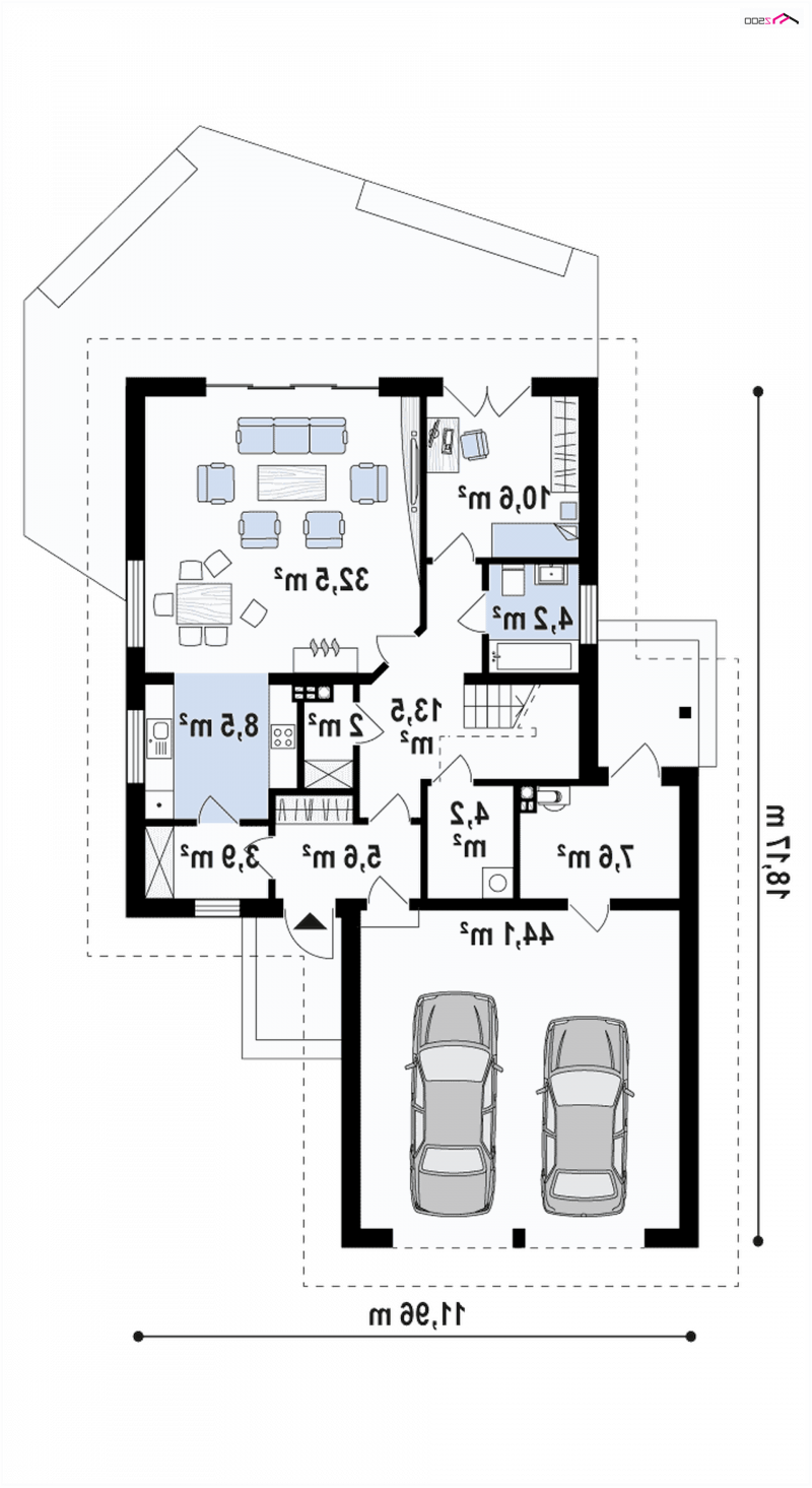 Kluczowy zamysł projektu polega na tym, aby we frontowej części parteru zawrzeć pomieszczenia niewymagające szczególnego ogrzewania, natomiast w tylnej części domu umieścić pomieszczenia, w których koncentruje się życie domowników. Dlatego dwustanowiskowy garaż, pomieszczenie gospodarcze, pralnia, spiżarka i sień zostały zaprojektowane blisko siebie.