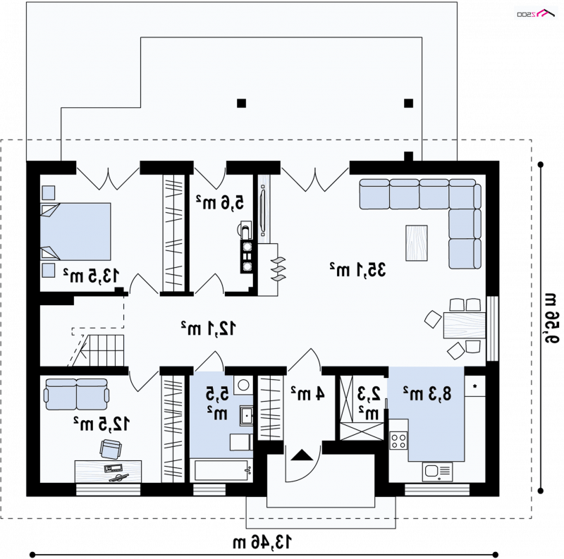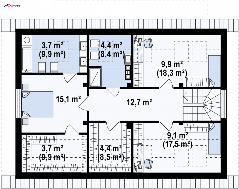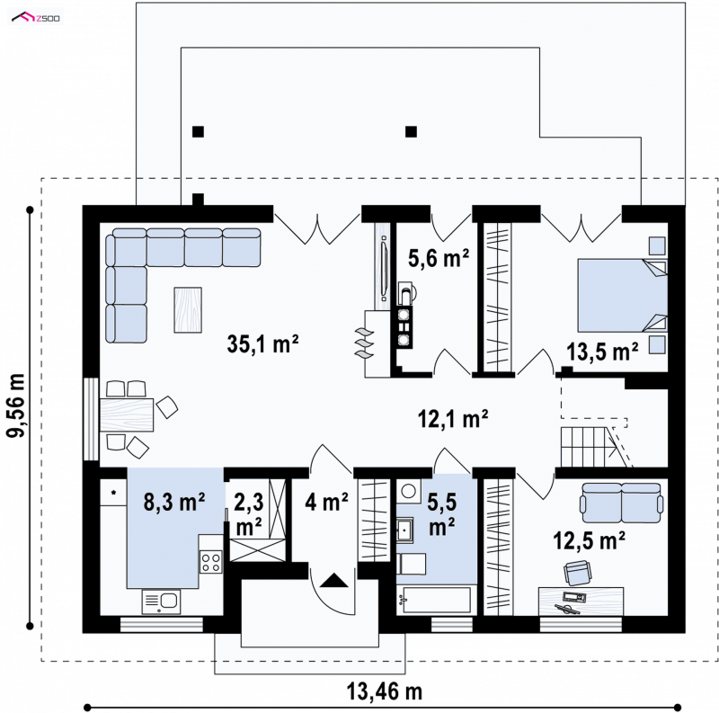 Całość powierzchni użytkowej projektu Z343 wynosi ok. 160m2. Jest on idealny dla osób, które chcą mieć wystarczająco dużą powierzchnię by móc wszystko pomieścić i jednocześnie wystarczająco małą do samodzielnego sprzątania.
