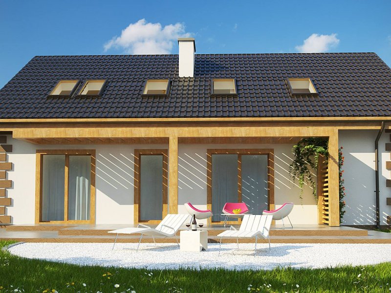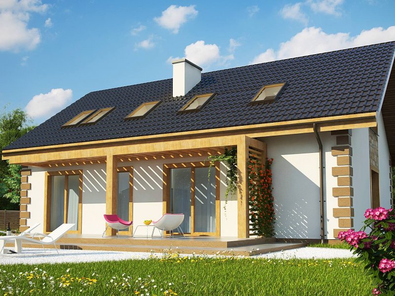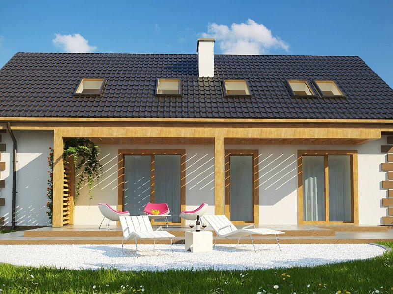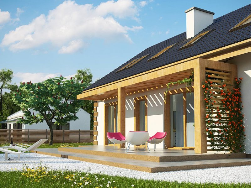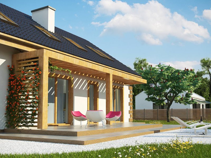 Parter można podzielić na dwie części domu. Przestronny salon, kuchnia, jadalnia i spiżarka mogą stanowić cześć dzienną domu. Na część nocną składają się dwa pokoje, które mogą być przeznaczone dla osób starszych. Mogą też służyć jako gabinety pracy rodziców lub jako biuro. Taras wypoczynkowy zadaszono drewnianą pergolą. Prowadzą na niego wyjścia ze wszystkich pomieszczeń położonych od strony ogrodu, łącznie z pomieszczeniem gospodarczym, które pomieści kosiarkę i narzędzia ogrodnicze.