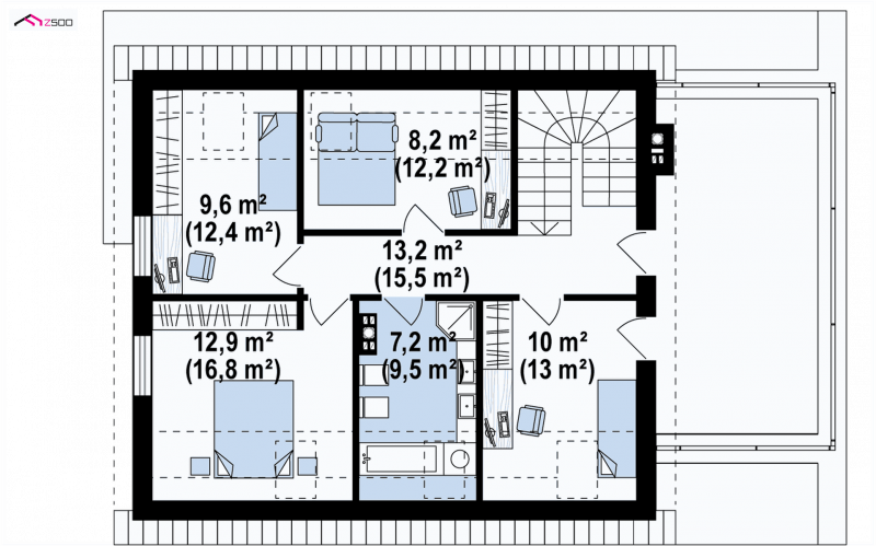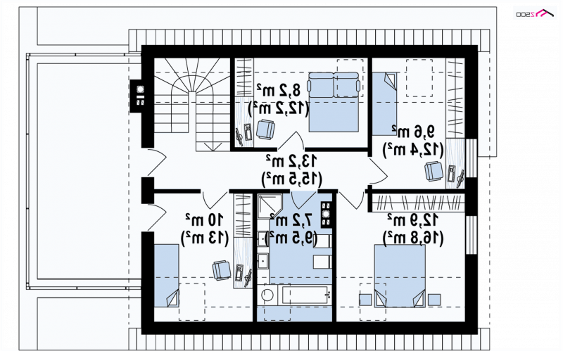Poddasze użytkowe zawiera 4 sypialnie oraz łazienkę, w której zmieści się prysznic, wanna, bidet i inne potrzebne do codziennej toalety sanitariaty.