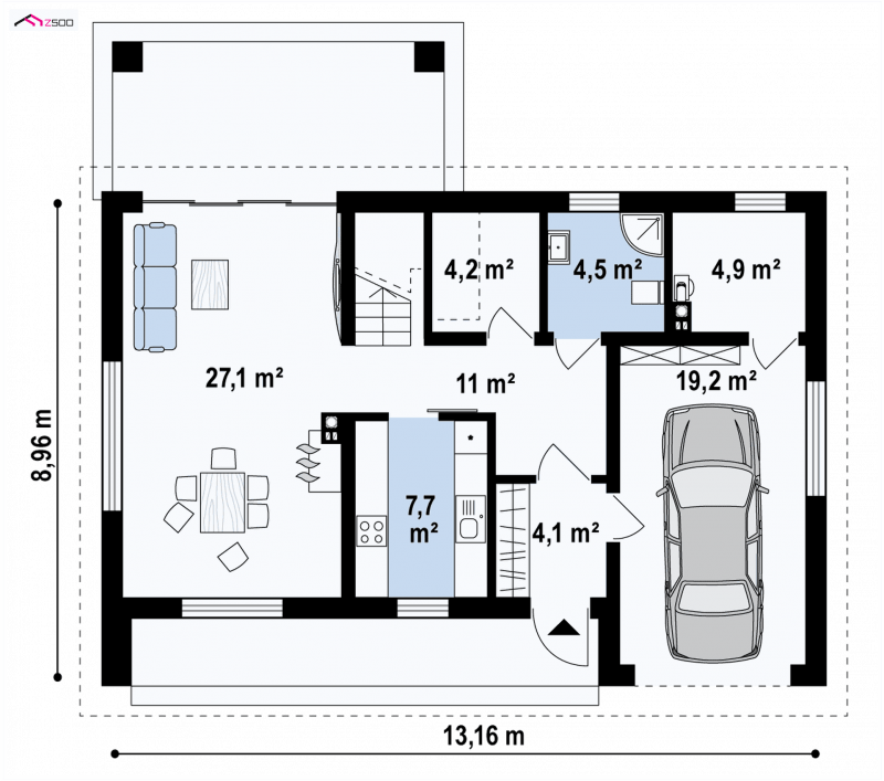 W parterze 1 stanowiskowy garaż posiada przejście do wnętrza domu, gdzie zamkniętą kuchnię i salon z jadalnią umieszczono od strony frontowej. Dzięki temu wyglądając przez okno będziemy wiedzieć czy chcemy otworzyć drzwi niezapowiedzianym gościom, czy jednak pragniemy uniknąć niechcianej wizyty…