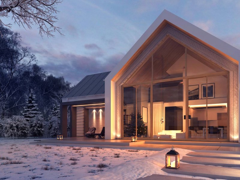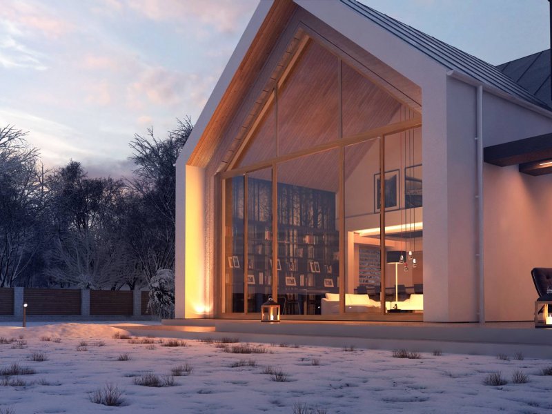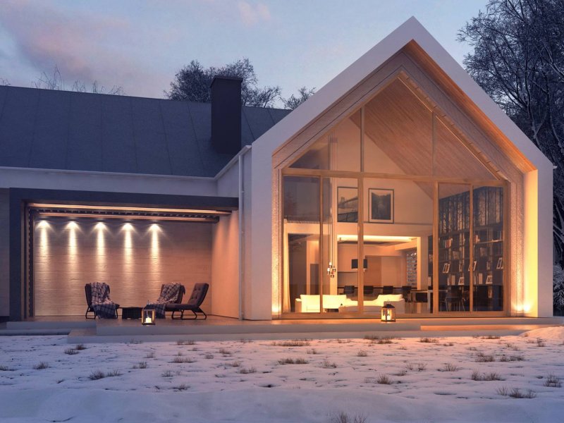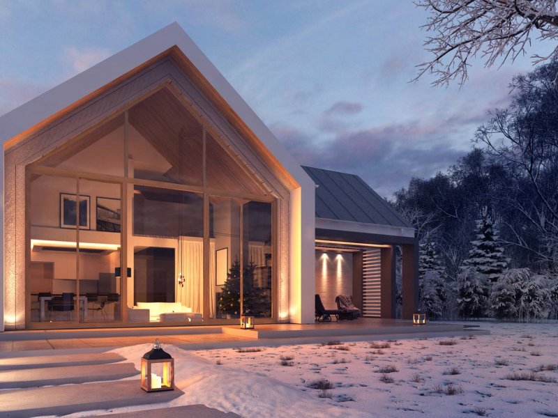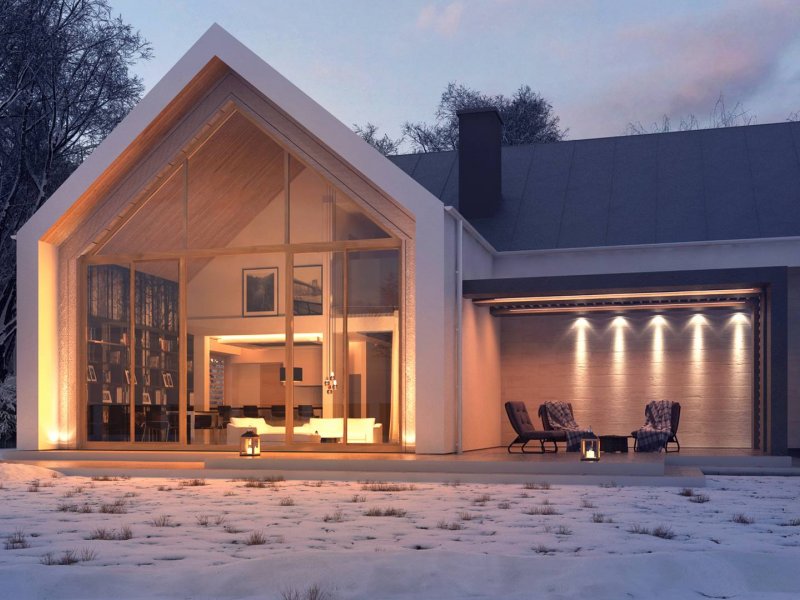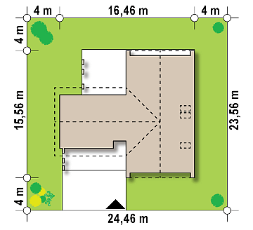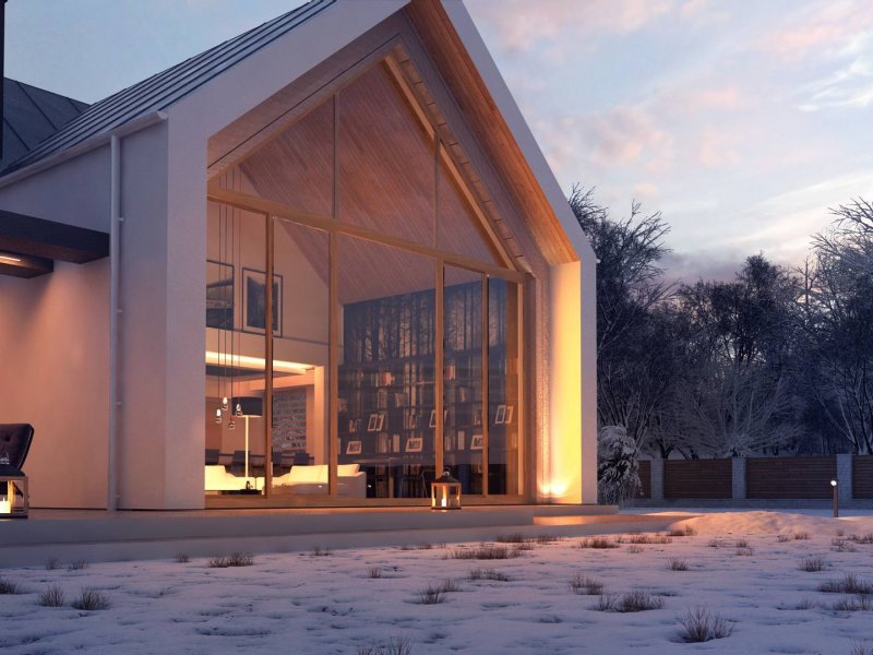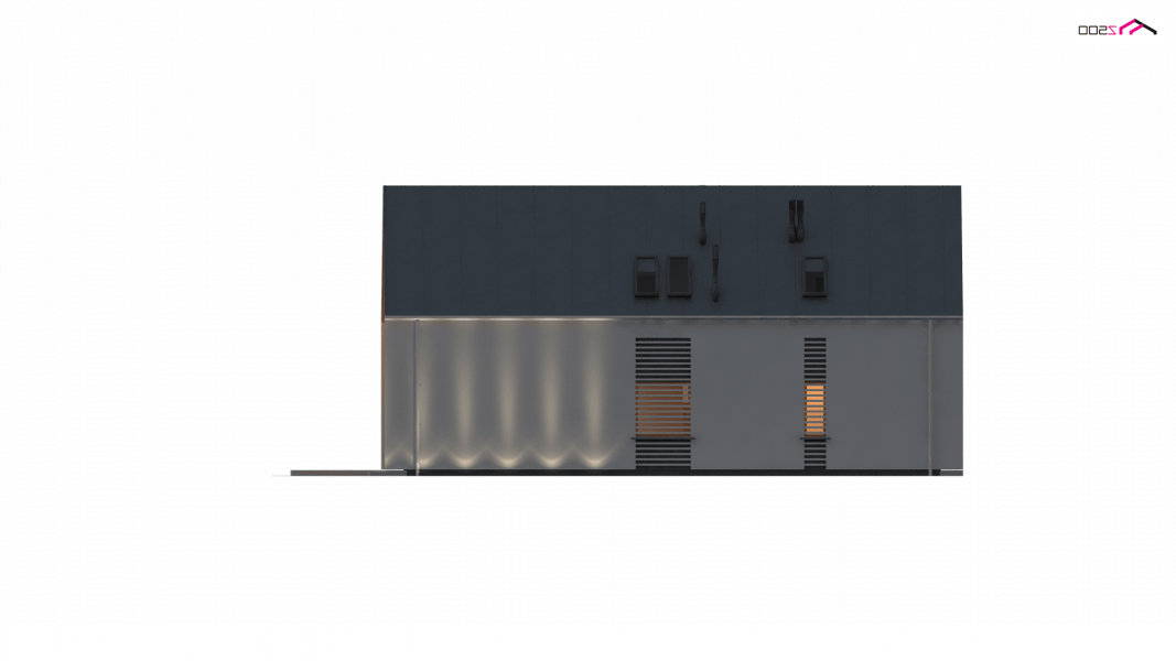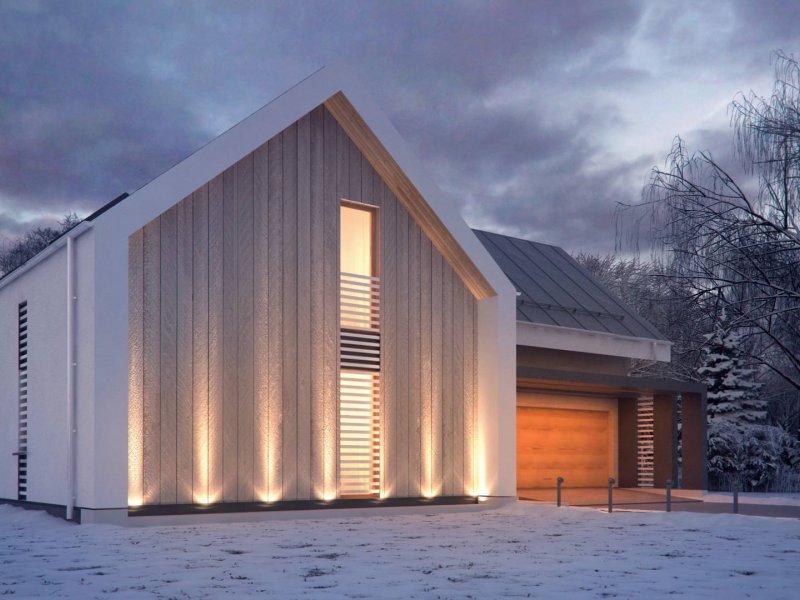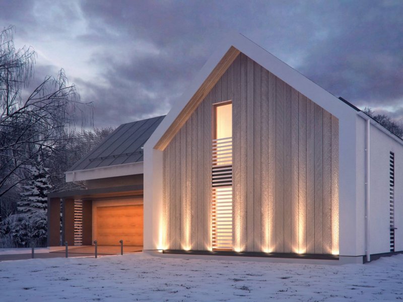 Konstrukcja zadaszenia przedniej części domu jest tożsama z tylną, natomiast elewacje wykonano w jasnych kolorach, z płytek klinkierowych i białego tynku.