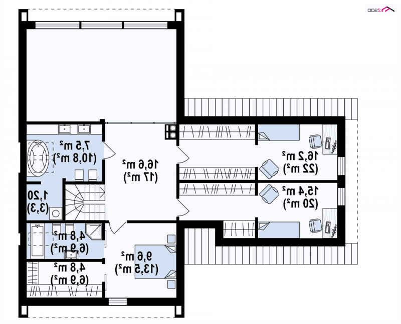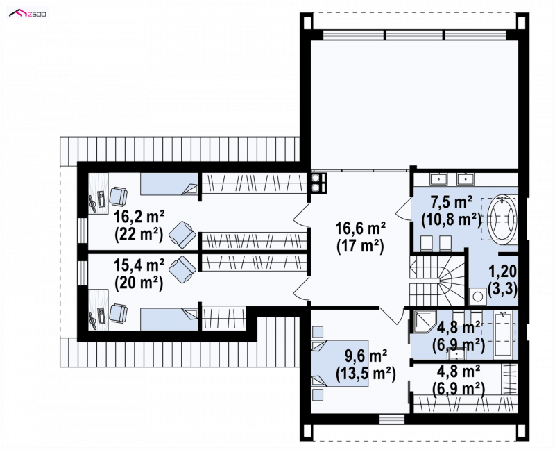 Poddasze użytkowe stanowiące piętro, to nocna strefa domu. Mieści się tam druga główna sypialnia z prywatną łazienką i garderobą, oraz dwie sypialnie z garderobami dla dzieci.